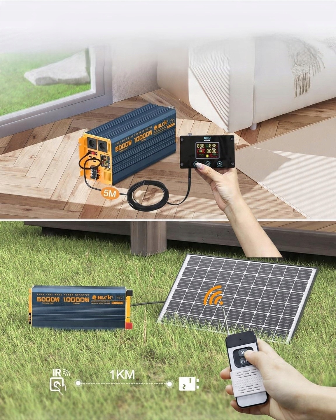 - 【РК-дисплей і пульт дистанційного керування】Постійно оновлюваний РК-дисплей інвертора 5000 Вт 48 В відображає вхідну та вихідну напругу в реальному часі, ємність батареї та індикатор захисту, що робить стан використання інвертора більш чітким. З дистанційним керуванням вмикати та вимикати зручніше.
