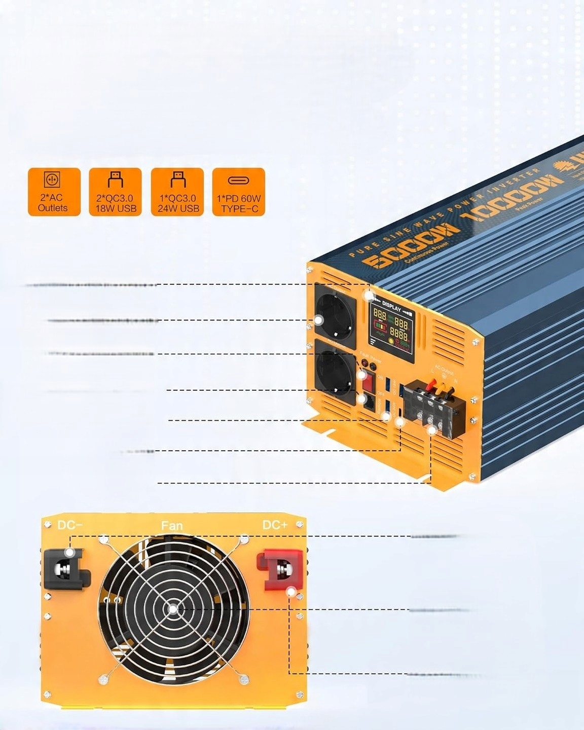 - 【БЕЗПЕКА ТА ЗАХИЩЕННЯ ВЕНТИЛЯТОРОМ ОХОЛОДЖЕННЯ】Автомобільні інвертори мають вбудований запобіжник, захищений від струмів короткого замикання та зворотної полярності клем акумулятора, тому акумулятор не розряджається через перенапругу та перевантаження. Два вбудовані інтелектуальні вентилятори можуть автоматично вмикатися, коли інвертори нагріваються після простою або після ввімкнення, таким чином запобігаючи нещасним випадкам, спричиненим перегріванням.