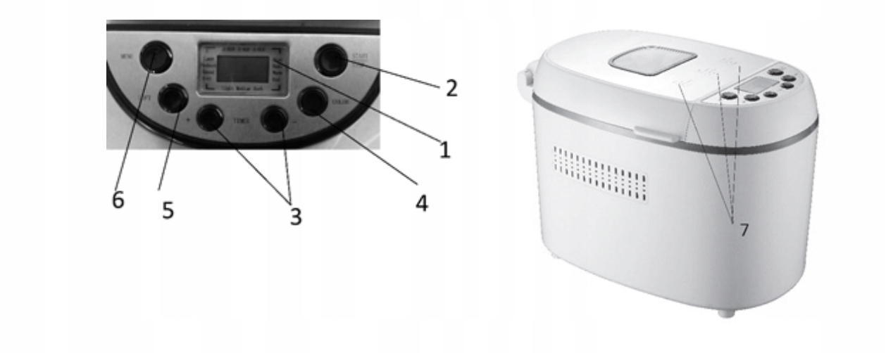 - 1. РК-дисплей - відображає номер обраної програми, рівень випічки, вагу хліба, час випікання