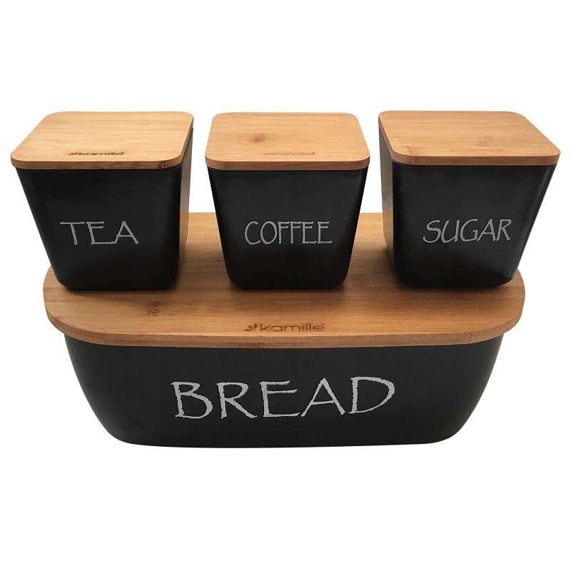 Стильна та сучасна хлібниця Kamille з бамбуковою обробною дошкою та контейнерами ідеально підходить для зберігання кави, чаю та цукру. Завдяки оригінальному дизайну контейнери стануть цікавим декоративним елементом кухні.