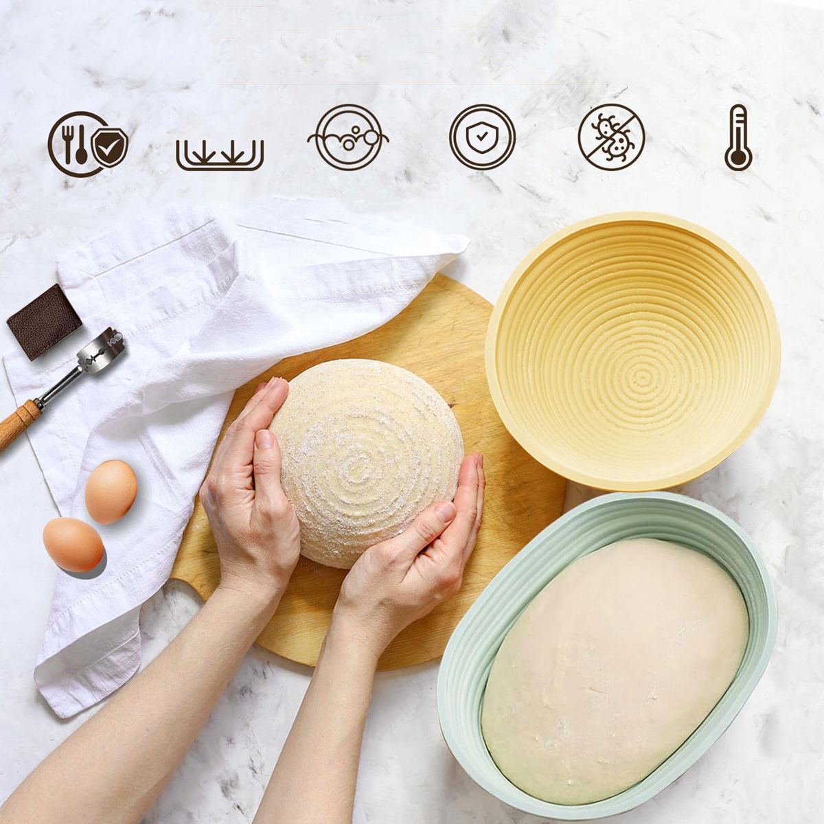 🥖🥖Простий у використанні та чищенні. Ці круглі овальні корзини виготовлені з харчового силікону, який не містить бісфенолу А, який витримує температуру до 450°F / 230℃. Крім замішування тіста, його можна також випікати прямо в духовці, не потрібно класти його в миску. Нелипкий силіконовий матеріал можна очистити безпосередньо водою, а після складання його можна зберігати прямо в шафі, не займаючи зайвого місця.