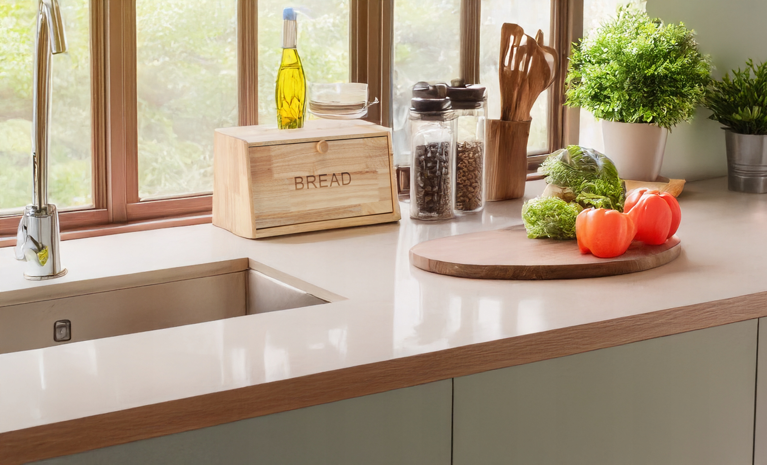 - Матеріал: Міцний та екологічний бамбук - натуральний матеріал, стійкий до вологи та деформації, ідеально підходить для кухні Дверцята, що відкриваються: зручна система відкривання на лицьовій стороні, що забезпечує легкий доступ до хліба та економію місця на стільниці.