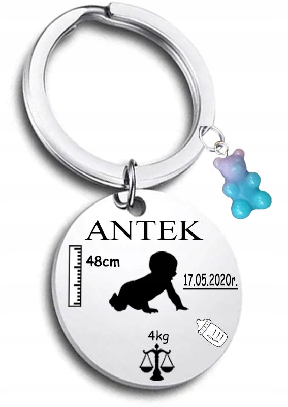 БРЕЛОК ДЛЯ ХЛОПЧИКА ДІВЧИНКИ ВАГА ІМ'Я ЗРІСТ ДАТА ГРАВІЮВАННЯ + ВЕДМЕДИК