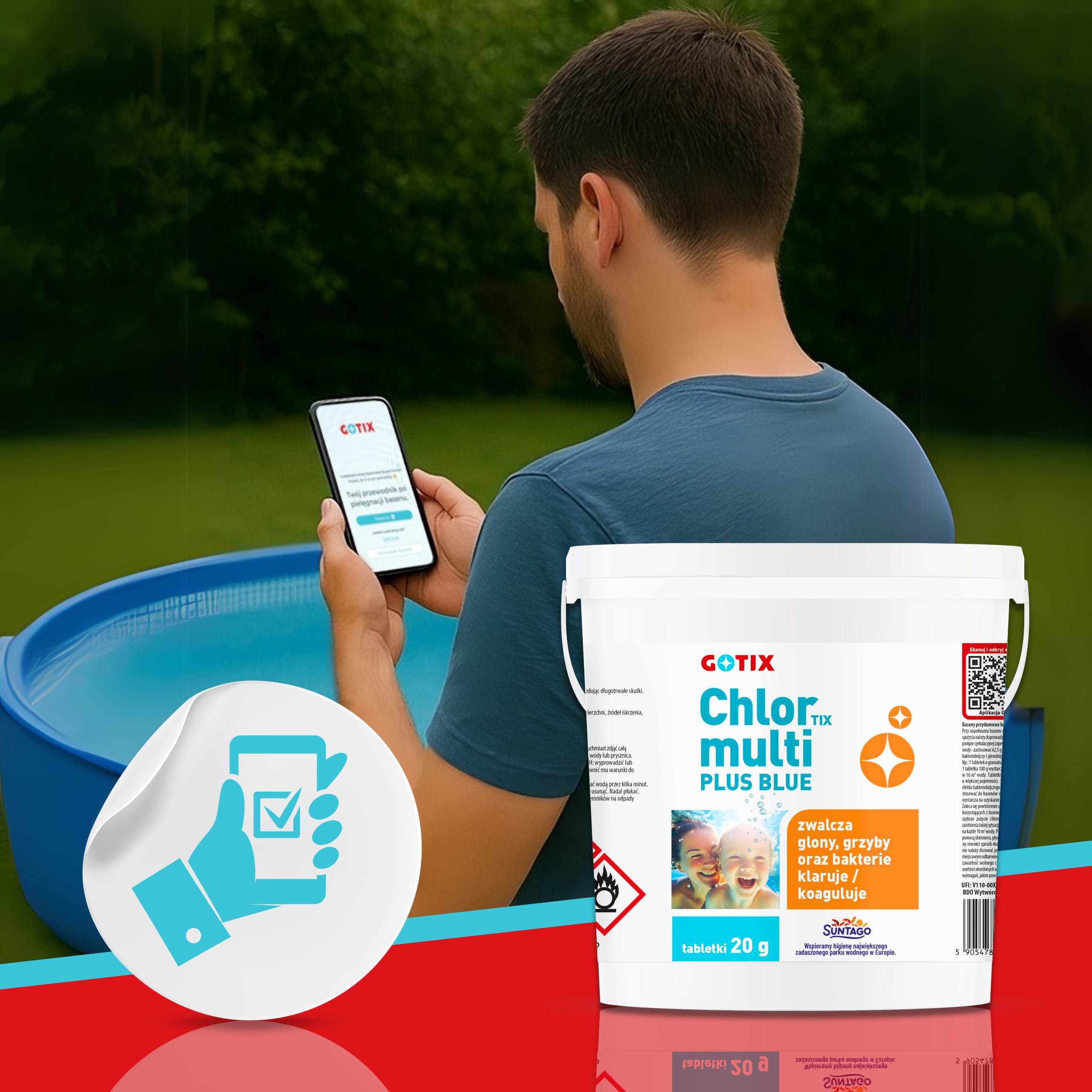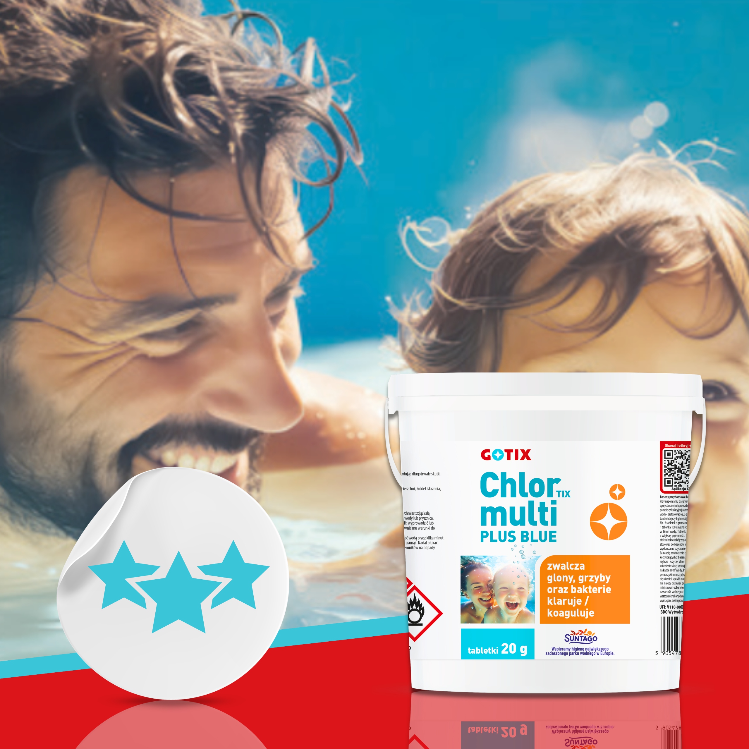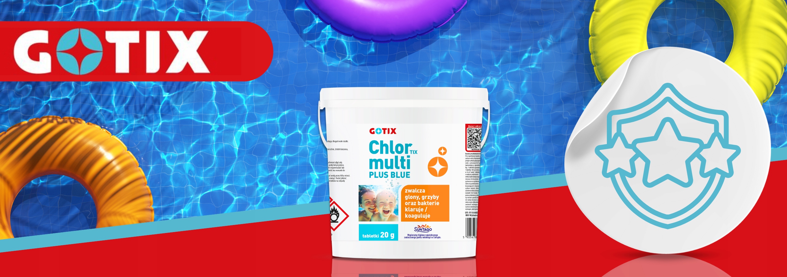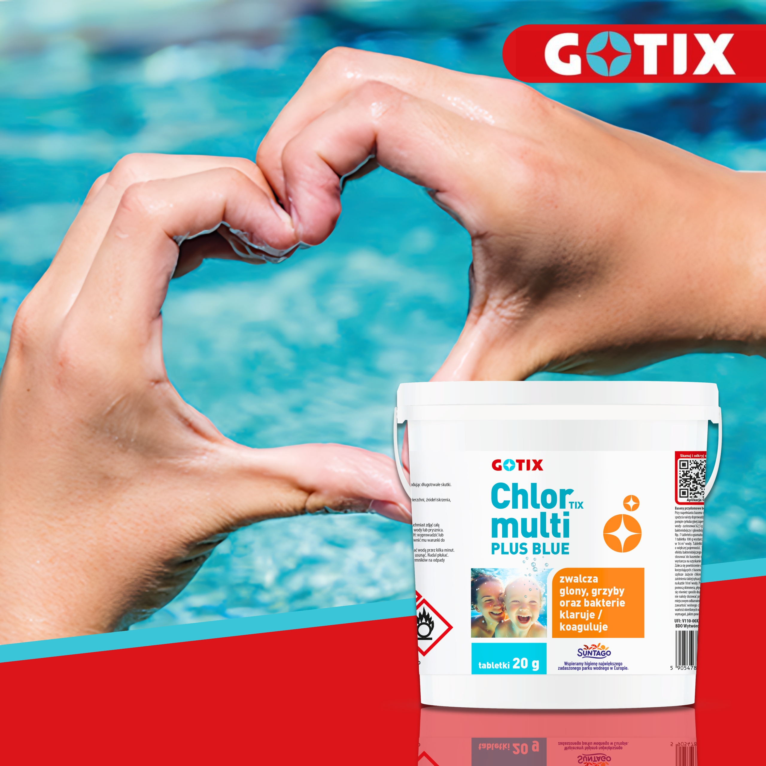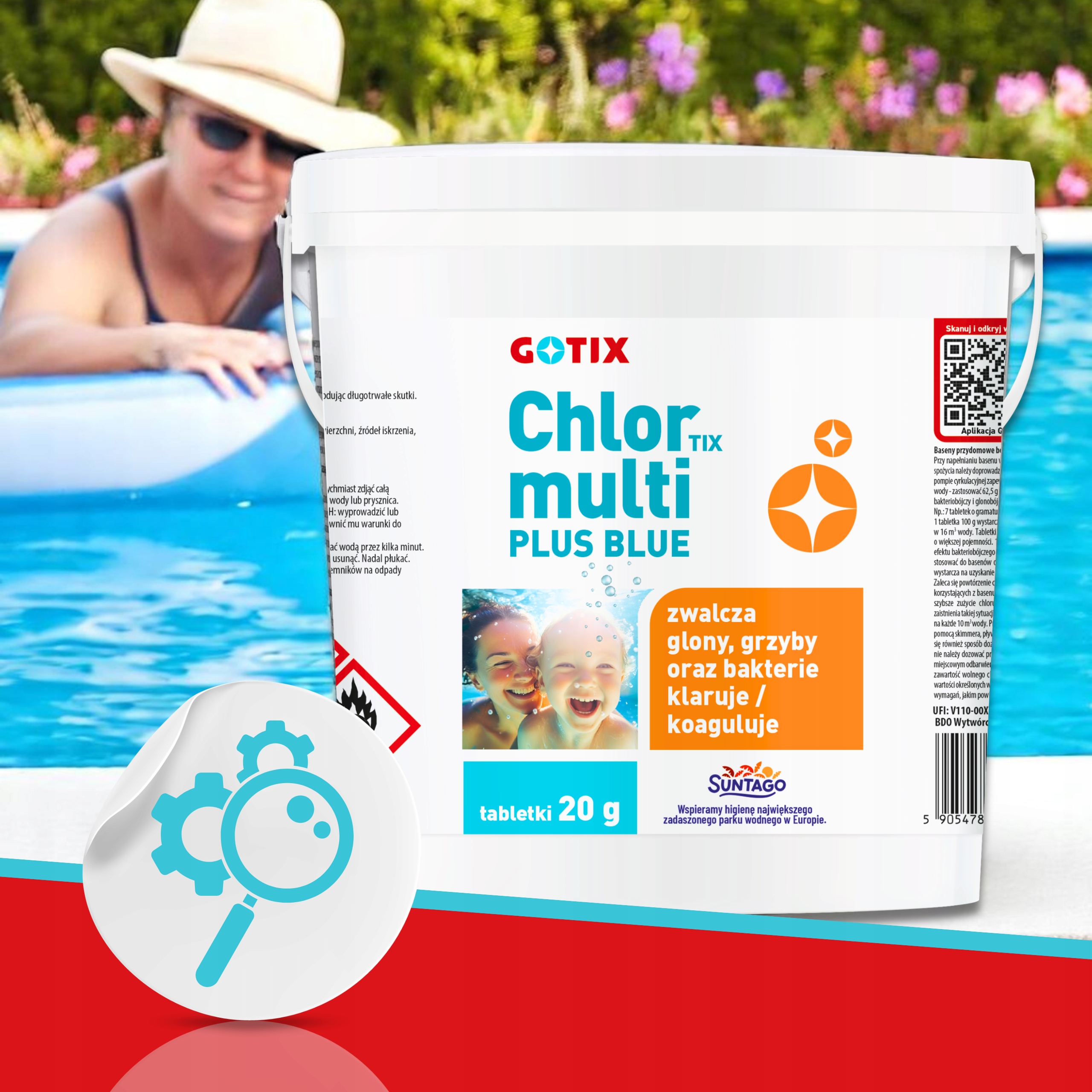 Gotix Chlortix Multi Plus Blue твори бактерициди , водорості та фунгіциди. -це професійна підготовка у вигляді повільних таблетів хлориду , що роз'яснює та стабілізує воду. Ідеально підходить для щоденного догляду за водою в басейні , спа -центрі та джакузі .