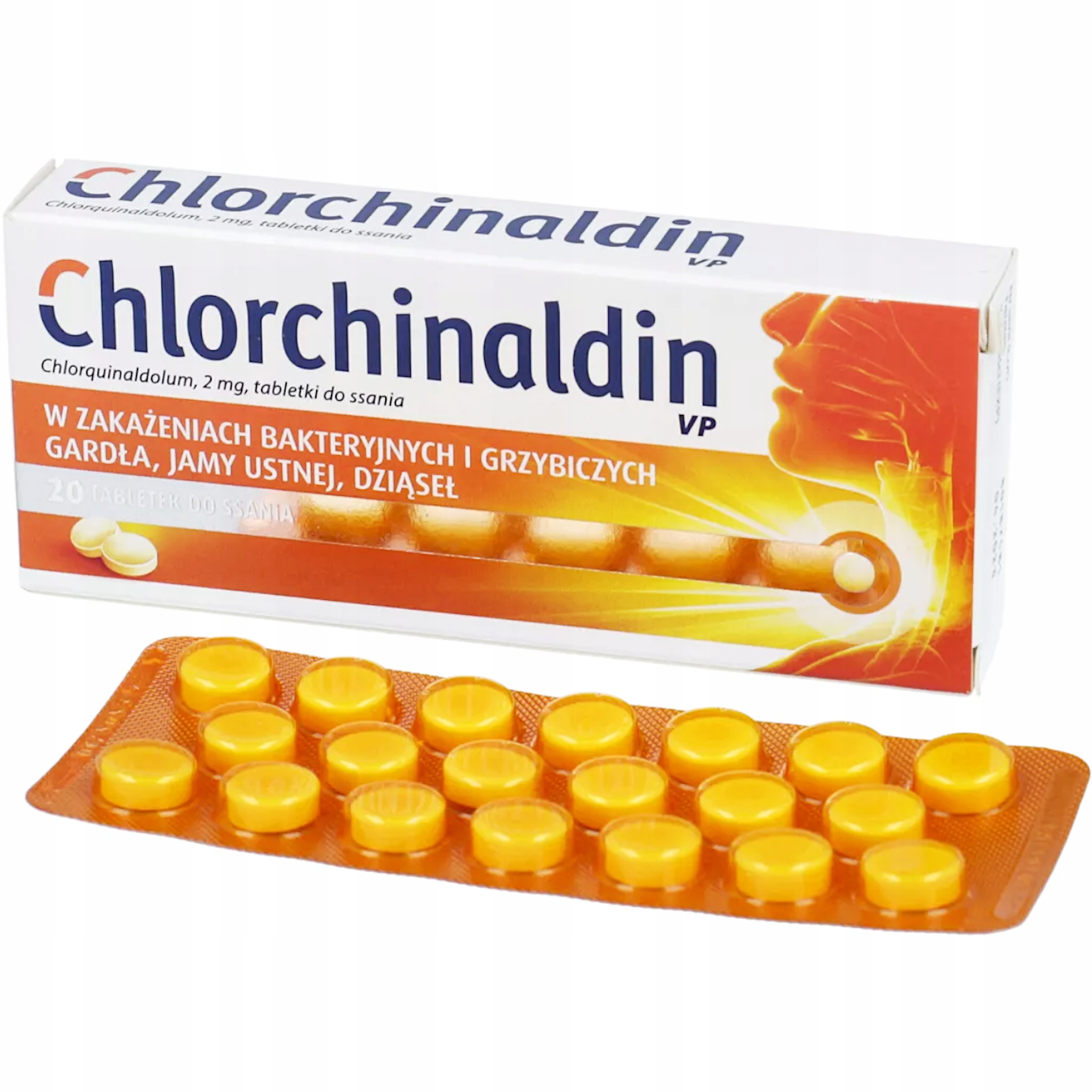 Chlorchinaldin VP 2 mg – це препарат у формі льодяників, придатний для застосування у випадках бактеріальної інфекції ротової порожнини і ясен, грибкові інфекції ротової порожнини і горла, а також молочниця. Кожна з 20 таблеток препарату містить 2 мг діючої речовини - хлорхінальдолу (Chlorquinaldolum). Картонна упаковка препарату містить 20 таблеток у блістері з алюмінієвої фольги та полівінілхлориду.