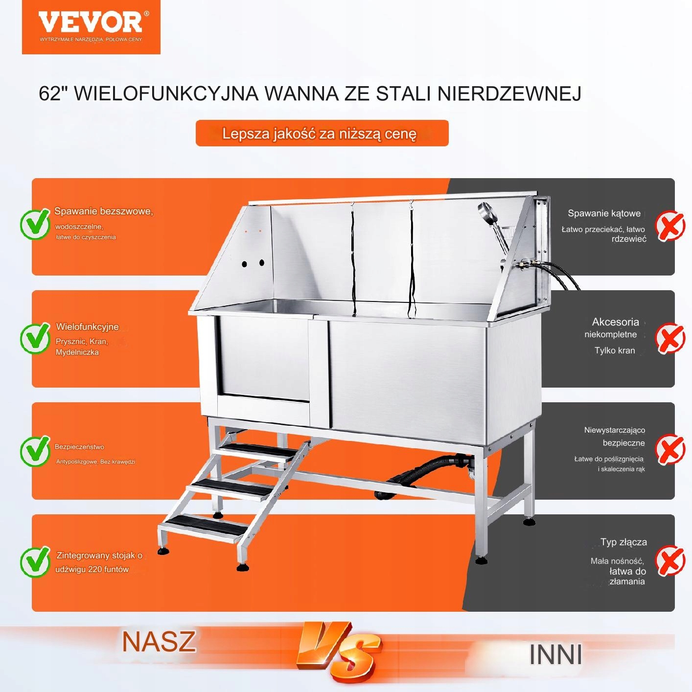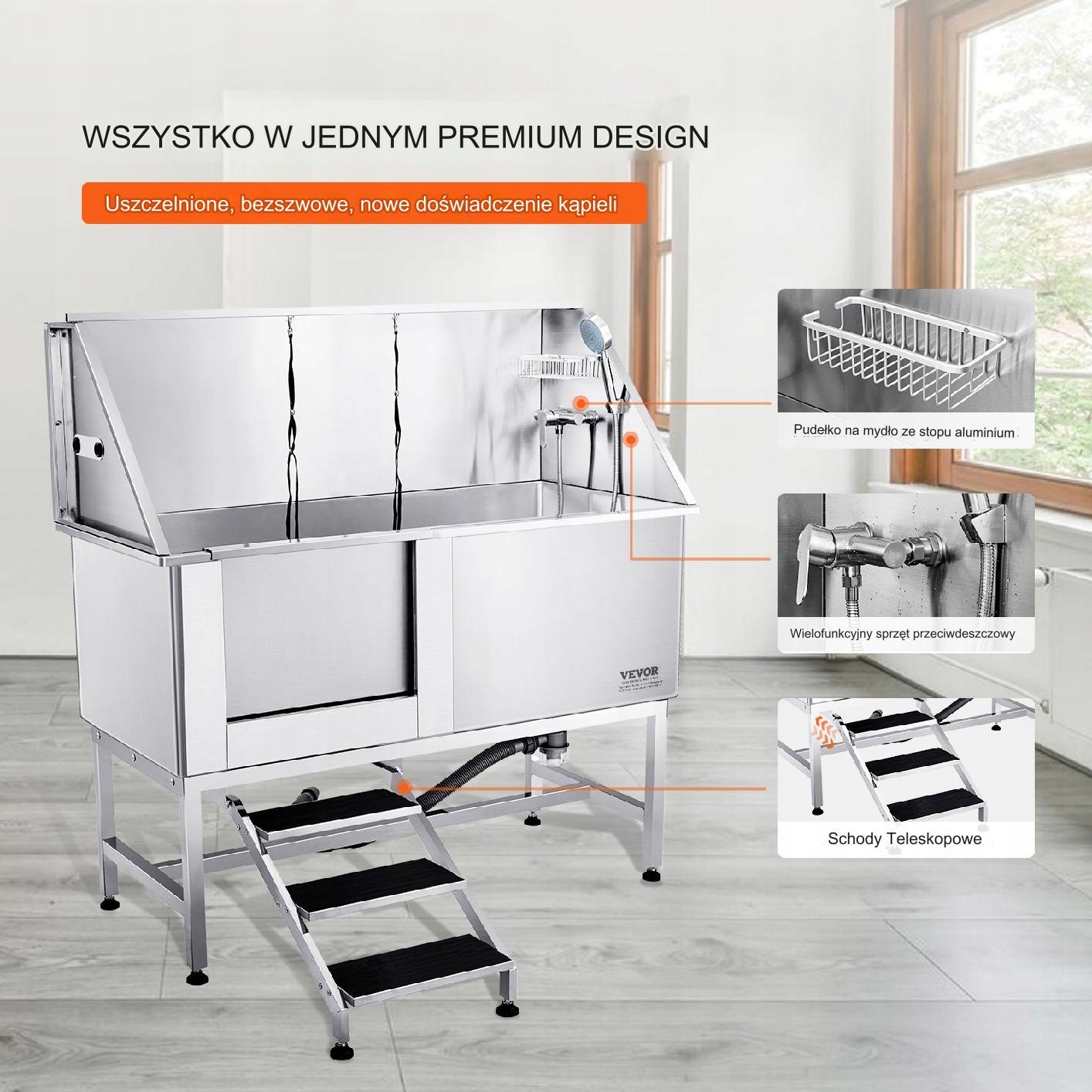 оснащений верхньою та нижньою пандусом, що не належить до ковзання, та універсальною душовою системою. У посуді з милом ви можете покласти засоби для чищення для тварин, а герметична засувка не витікає воду, забезпечуючи безтурботну ванну.