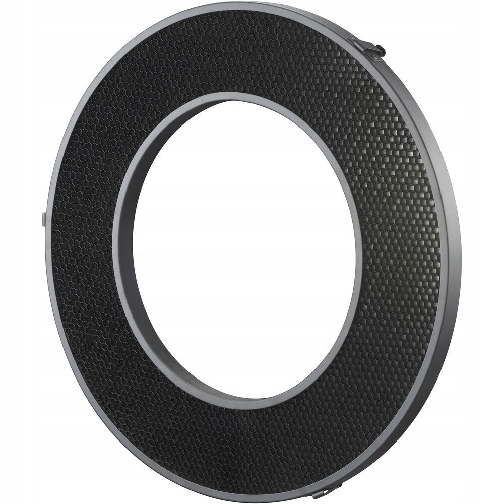 сітка з створом структурою виготовлена з чорного пофарбованого алюмінію. Модифікатор легко встановити на зовнішньому краю відбивача Godox RFT-25S і зберігається на місці з трьома кліпами. Медовий шматочок (сітка) з кутом відволікання 30 ° звужує промінь світла, що генерується самим спалахом, створюючи керований і цільовий світлий потік.
