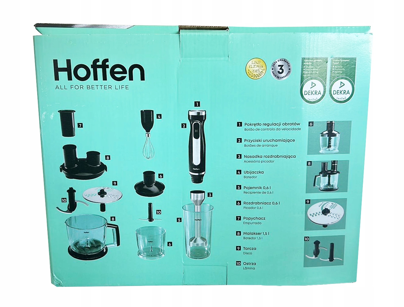Ручний блендер з Hoffen Blender оснащений блендером, який має різання ножів з високоякісної нержавіючої сталі, яка ідеально впорається з фрагментацією інгредієнтів на менші шматки. Він ідеально відповідає кожній руці, і матеріал, що не є, гарантує безпеку підтримки пристрою навіть при змішуванні найскладніших продуктів.