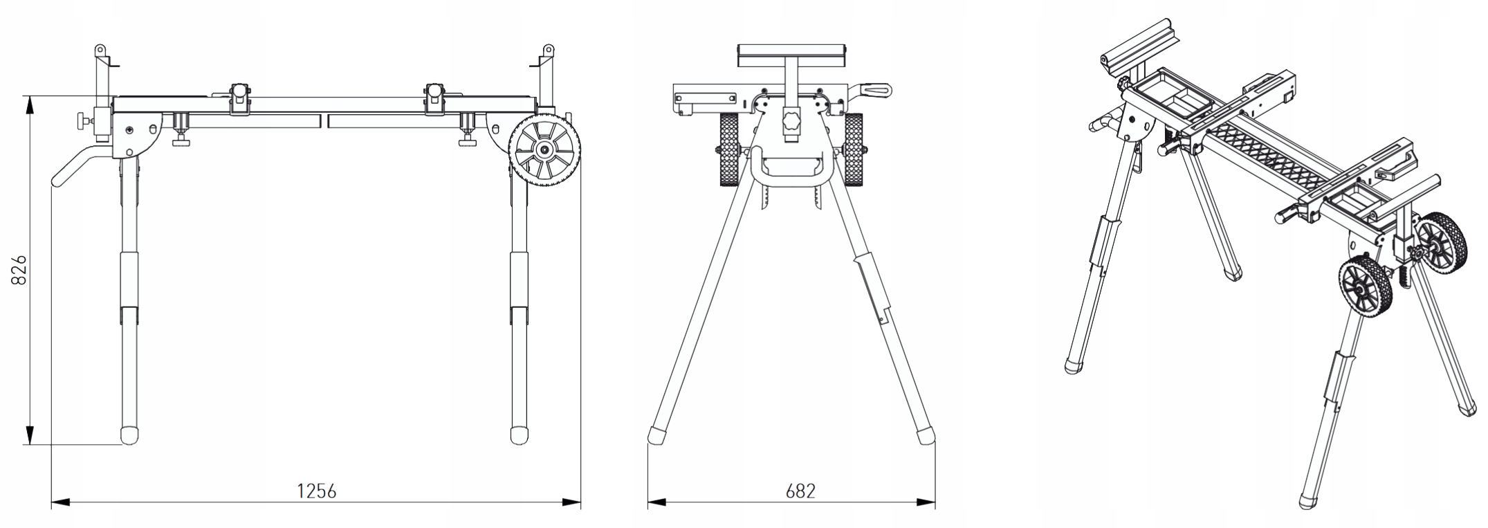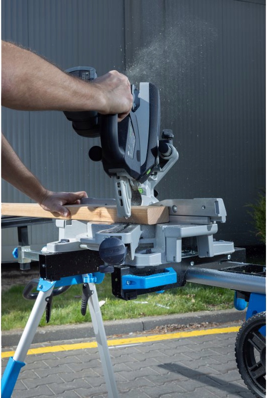 Мобільний складаний робочий стіл завдяки універсальним ручкам він може служити основою для торцювальних і стрічкових пилок більшості виробників.