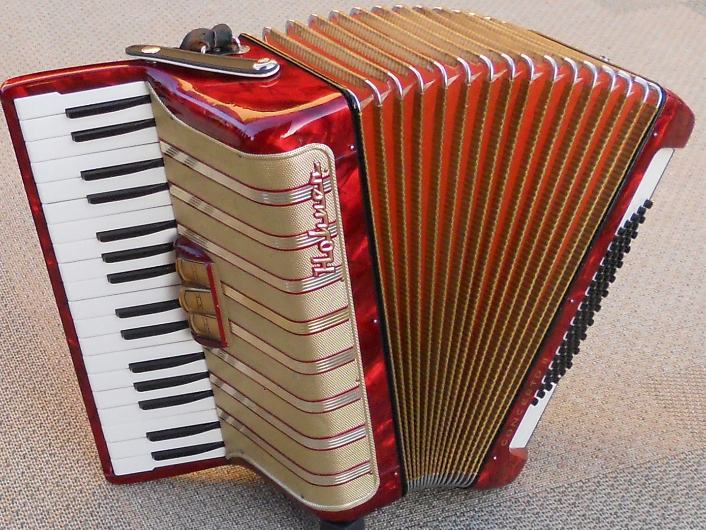 Акордеон поставляється з оригінальними ремінцями та футляром Hohner.