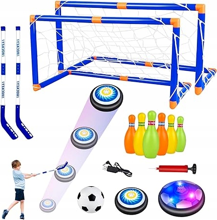 Універсальний спортивний набір для дітей від 5 років. Набір поєднує в одному наборі футбол, хокей і творчі ігри. Hoverball зі світлодіодними ліхтарями забезпечує видимість, а можливість зарядки через USB усуває необхідність заміни батарей. У набір також входять дві воріт, дві ключки, шість кеглів і дві світлодіодні кулі, які підсвічуються під час гри. 🏆⚽️🏒🔋