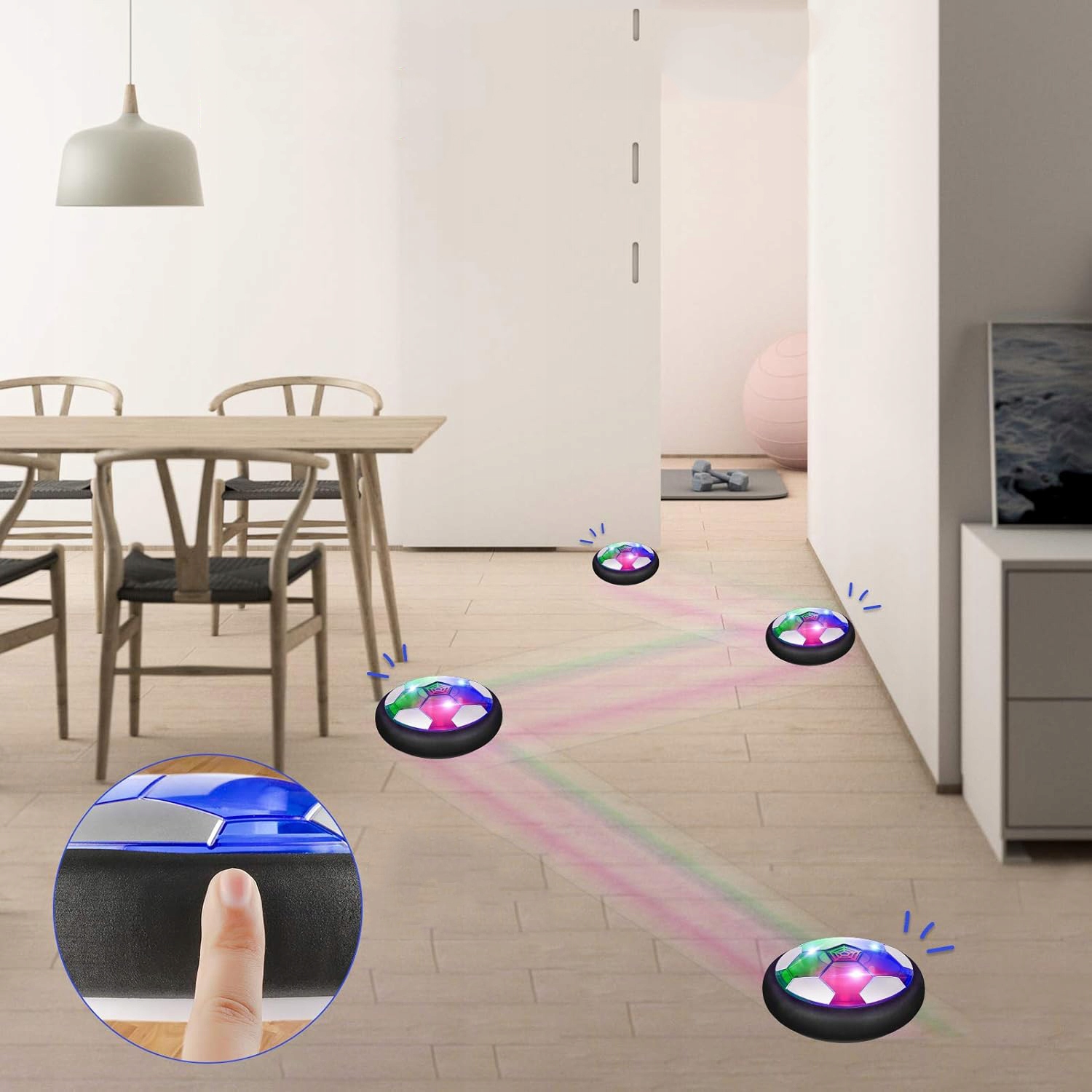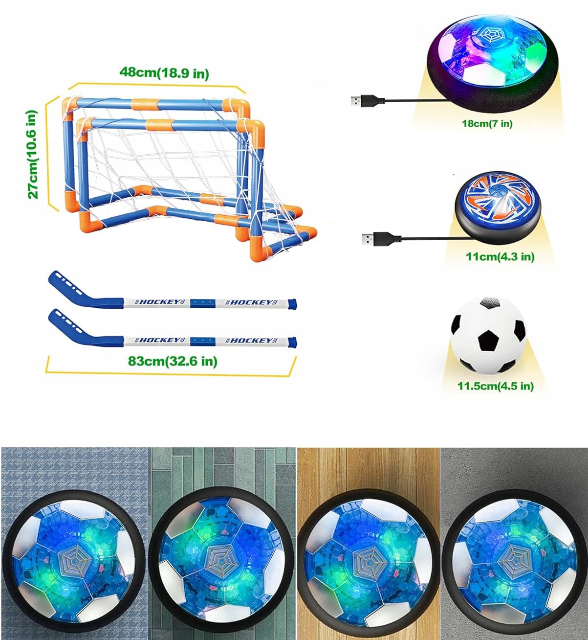 🏑🏑🏑 Багатозадачність та інтерактивні ігри: Завдяки пневматичній підвісці плаваючі м’ячі можуть легко ковзати по рівній підлозі включаючи підвали, дерев’яні підлоги, кахельні підлоги та килими з низьким ворсом. У будь-який дощовий або сонячний день вдома можна зіграти у футбол/хокей! Якщо ви хочете грати у своєму трав’яному саду, маленький надувний футбольний м’яч – це ваш вибір.