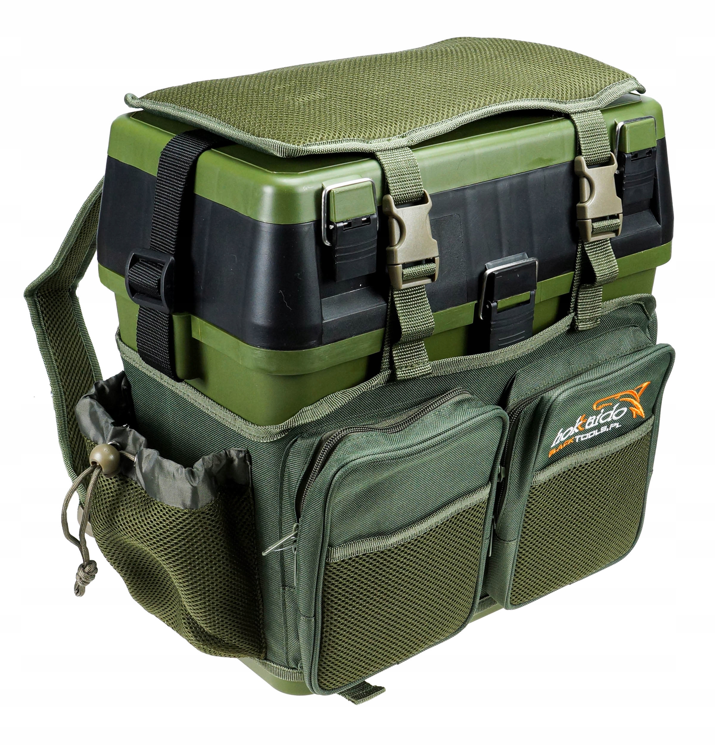 НОВИЙ рибальський ящик HOKKAIDO з пінопластовим сидінням. У створці, що піднімається вгору, розташовані чотири ящики, що закриваються на засувки для дрібного рибальського спорядження та приманок, у нижній частині кришки розташовані касети з відділеннями для аксесуарів середнього розміру.