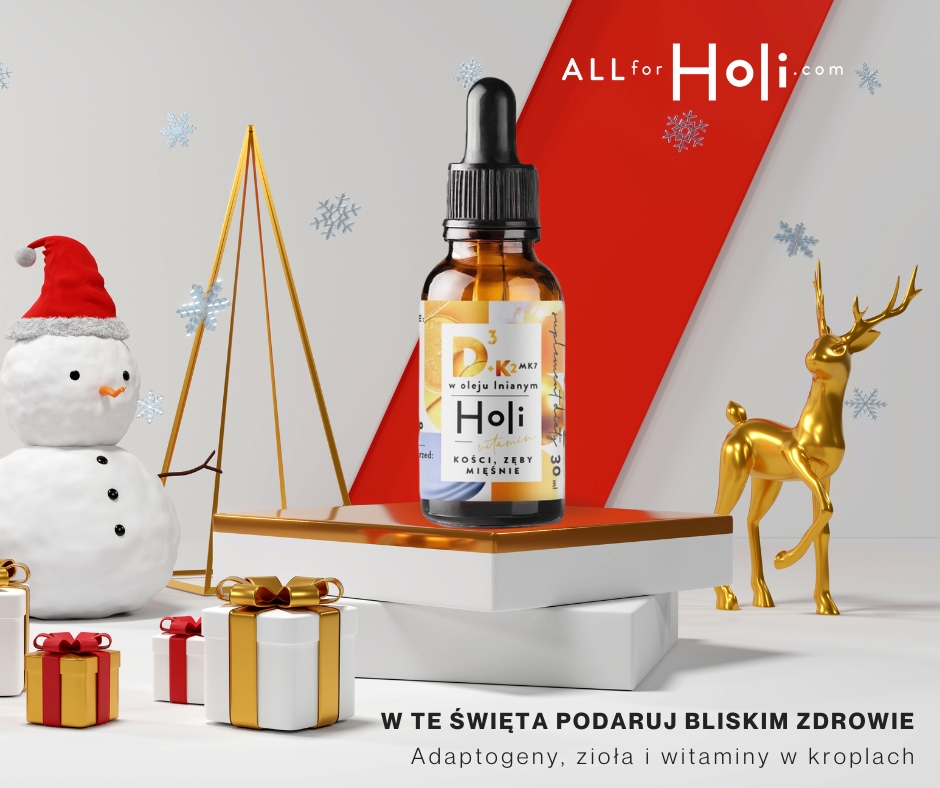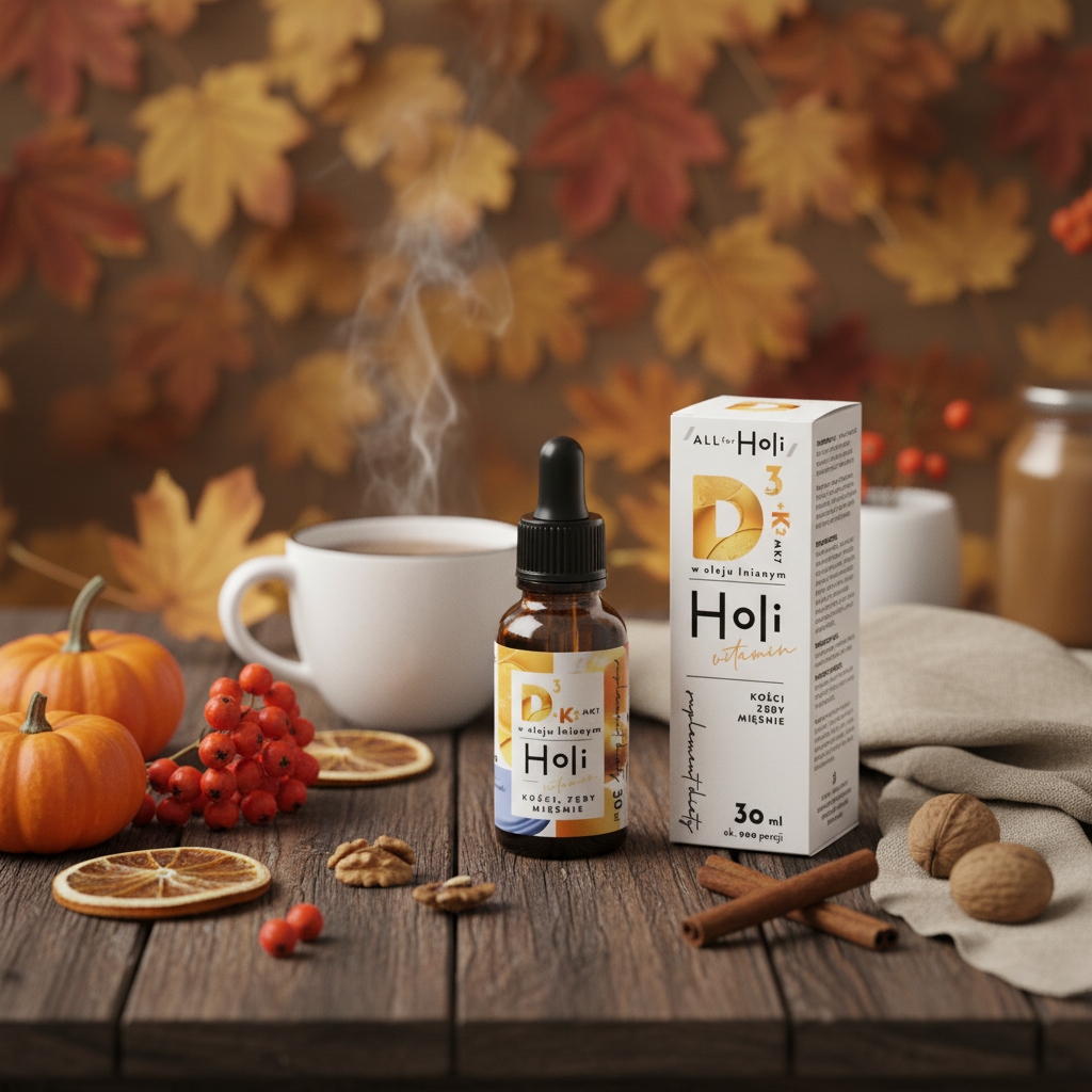 Holi Vitamin D3+K2 MK7 - це дієтична добавка у формі крапель, яка поєднує два ключових вітаміни: D3 (50 мкг = 1000% RWS) і K2 (MK7, 50 мкг = 67% RWS) - в лляній олії носій, який підтримує їх засвоєння та додає цінності у вигляді ненасичених жирних кислот