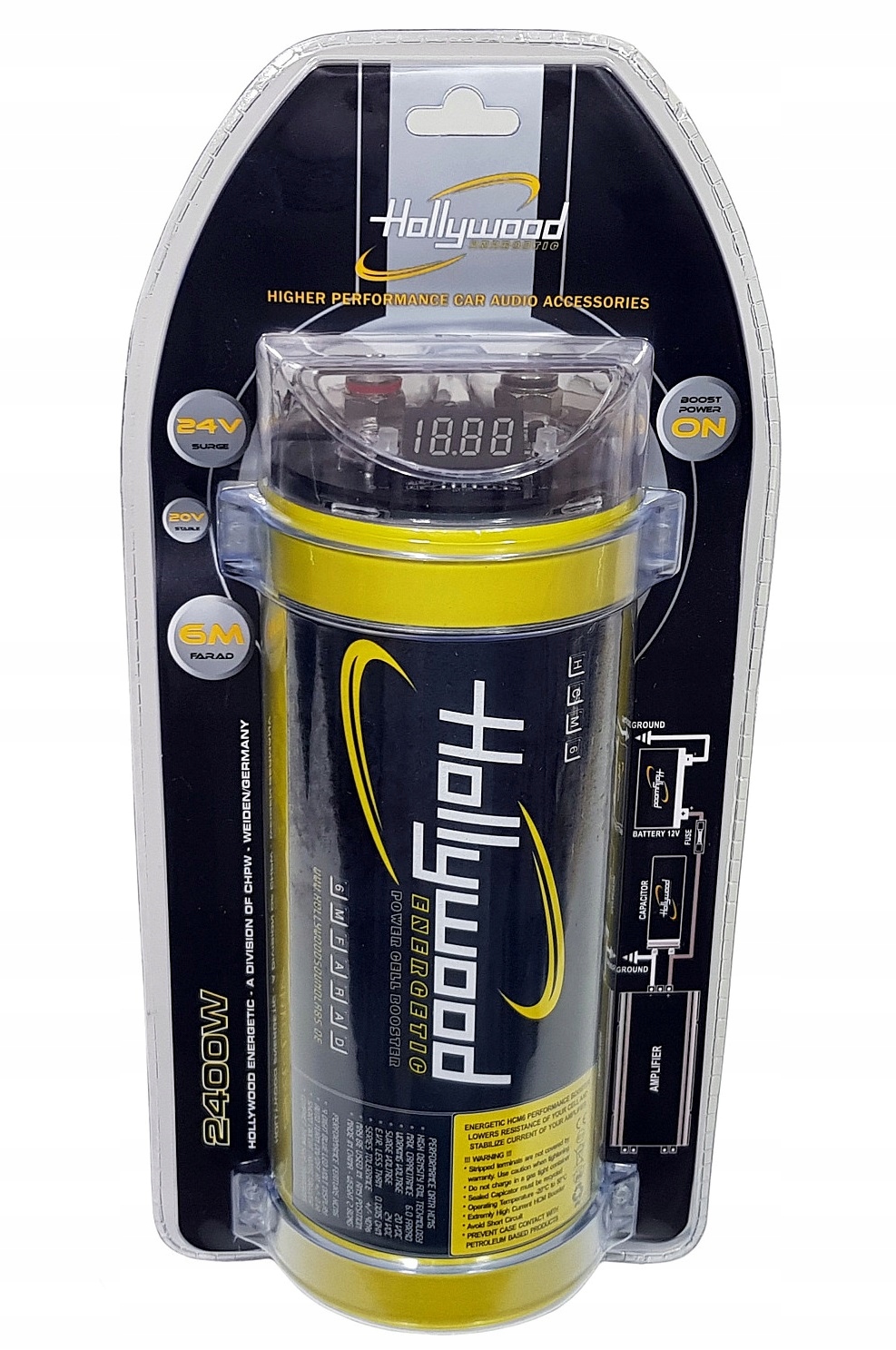 Дуже ефективний конденсатор ємністю 6 Фарад з вольтметром від німецького бренду Hollywood Energetic для підвищення стабільності та ефективності установки живлення автомобільної аудіосистеми. Завдяки використанню новітньої технології HDFT (High Density Foil Technology) із збільшеною щільністю внутрішньої електродної фольги вдалося досягти значно вищої ефективності порівняно зі старими конструкціями з аналогічною ємністю. Конденсатор HCM-6 HDFT може виступати в якості ефективного енергетичного банку стабілізації імпульсних перепадів і коливань напруги в установках, що живлять автомобільні аудіосистеми потужністю до 2400 Вт. Високий ККД при мінімально можливих розмірах конденсатора є одним з найважливіших параметрів в епоху дедалі менших і потужніших цифрових підсилювачів, які зазвичай використовуються в автомобільних аудіосистемах. Завдяки цьому Hollywood HCM-6 HDFT створює більші можливості установки у важкодоступних місцях автомобіля. Це також усуває багато обмежень, які раніше заважали завжди встановлювати такий великий додатковий банк енергії для підсилювача потужності якомога ближче до нього.