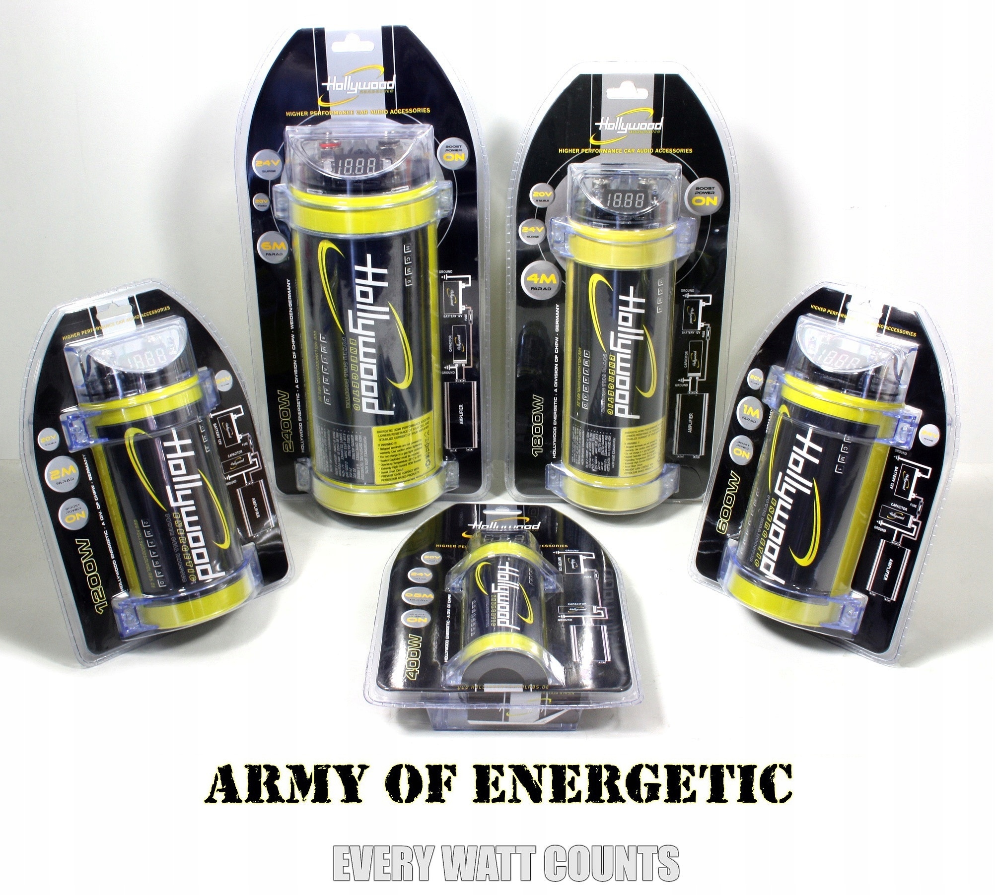 Основним завданням буферних конденсаторів Hollywood Energetic є збір і накопичення енергії, яку при необхідності можна швидко відібрати з неї і використати для підтримки живлення установки автомобільний підсилювач потужності. Найчастіше це відбувається при прослуховуванні більш гучної музики, що містить більш помітні басові імпульси, під час яких підсилювач споживає короткочасний, але значно більший струм, що найчастіше призводить до перепадів напруги та перепадів в установці, що живить аудіосистему автомобіля. Такі тимчасові нестачі енергії та перепади напруги негативно впливають на стабільність роботи та параметри підсилювача, що може призвести до появи додаткових спотворень у відтворюваному звуковому сигналі. Ці тимчасові недоліки енергії в установці живлення можуть бути частково доповнені та збалансовані запасом, що зберігається в конденсаторі. В результаті вплив перепадів імпульсів і коливань напруги, що живить підсилювач, мінімізується, що стабілізує умови його роботи, що призводить до кращої якості відтвореного звуку.