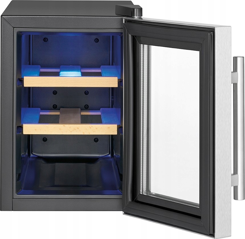 Винний холодильник загальною ємністю 17 л і місцем для 6 пляшок 0,75 л. Прозорий скляний фасад, внутрішнє освітлення та полиці з дерева роблять його ідеальним доповненням до елегантної кухні, готельного номера чи бару. Прилад має регульовану температуру охолодження в діапазоні від +11 до +18°C