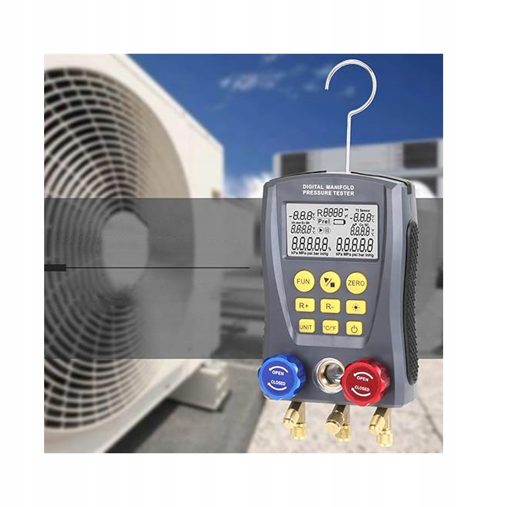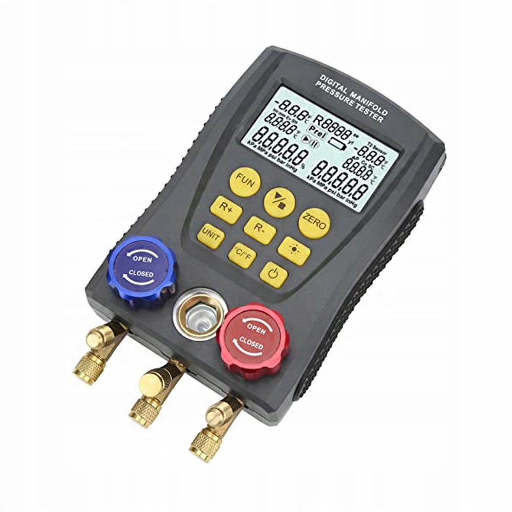 Ми пропонуємо сучасний цифровий прилад для перевірки тиску та витоку повітря, а також тиску холодоагенту, який є незамінним інструментом для професіоналів, що займаються встановленням, тестуванням та обслуговуванням холодильного обладнання, такого як кондиціонери повітря та холодильні камери.