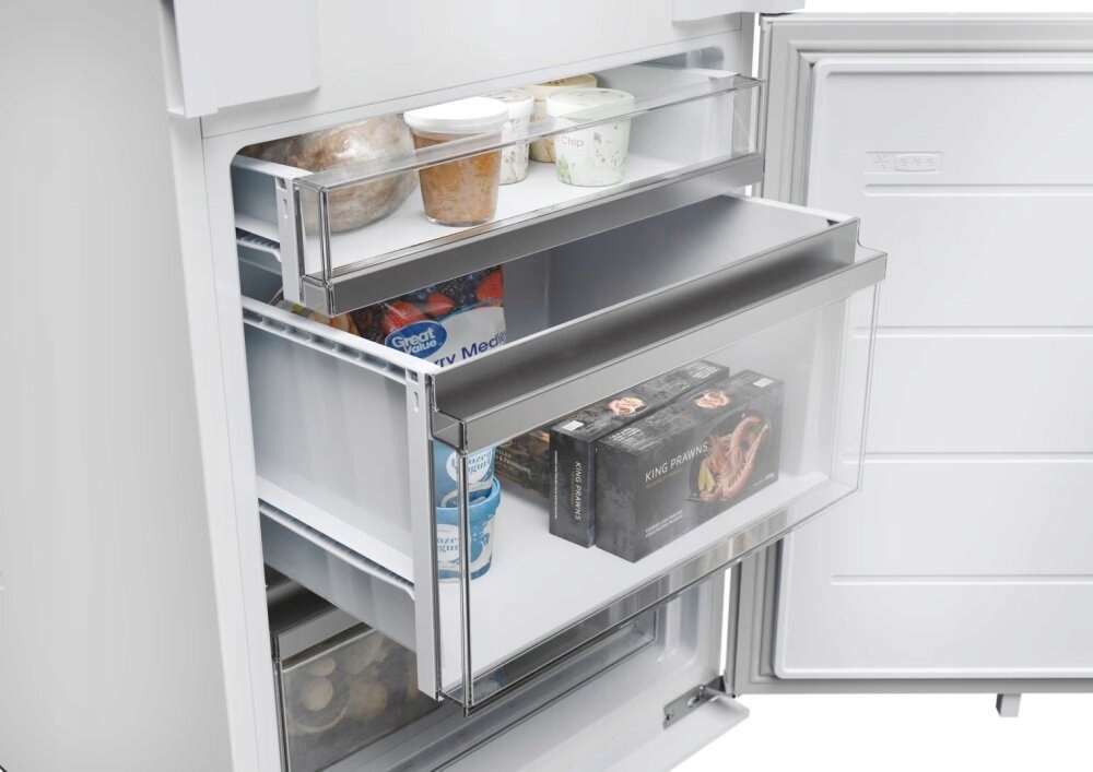 Три полиці із загартованого скла роблять інтер'єр холодильника не тільки красивим, але й легким у догляді. Їх виняткова міцність забезпечує безпечне зберігання продуктів, а завдяки можливості складання одного з них ви можете легко пристосувати простір до своїх поточних потреб.