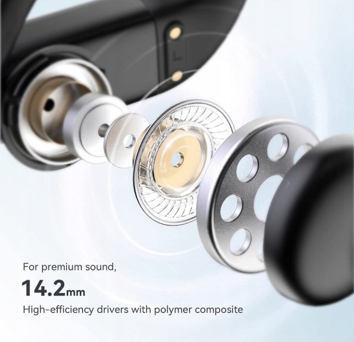 бездротові навушники використовують високоефективні 14,2 мм перетворювачі з мембранами, виготовленими з полімерного композиту, які забезпечують силу музичного звуку з дивовижно сильним басом. Незалежно від навколишнього середовища, в якому ви опиняєтесь, ви можете насолоджуватися динамічною та захоплюючою музикою та зосередитись на тренуванні.