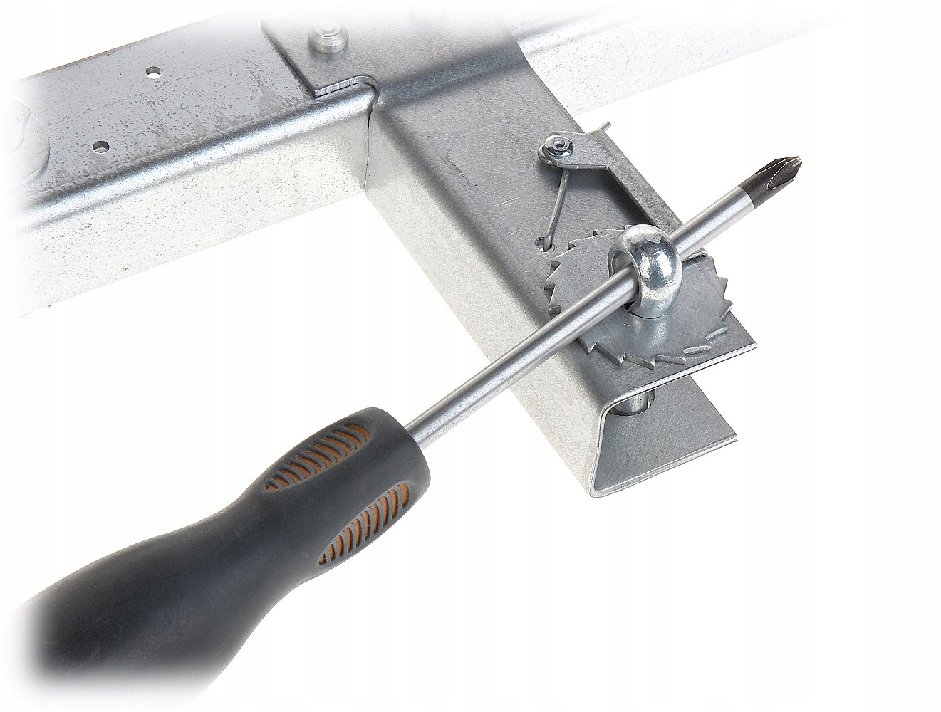 Кріплення стрічкою: протягніть 30 см стрічки через шплінт і намотайте її. Стрічка, прикріплена таким чином до одного кінця затискача, затягується на іншому кінці за допомогою тріскачки.
