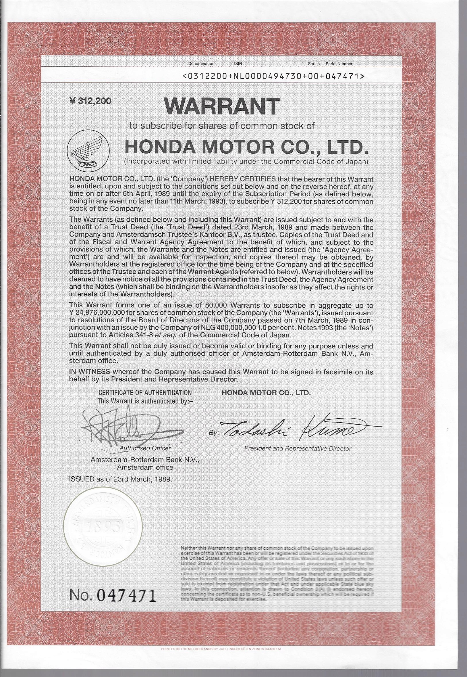 Honda Motor Co. Ltd. 1989 Дія / облігація