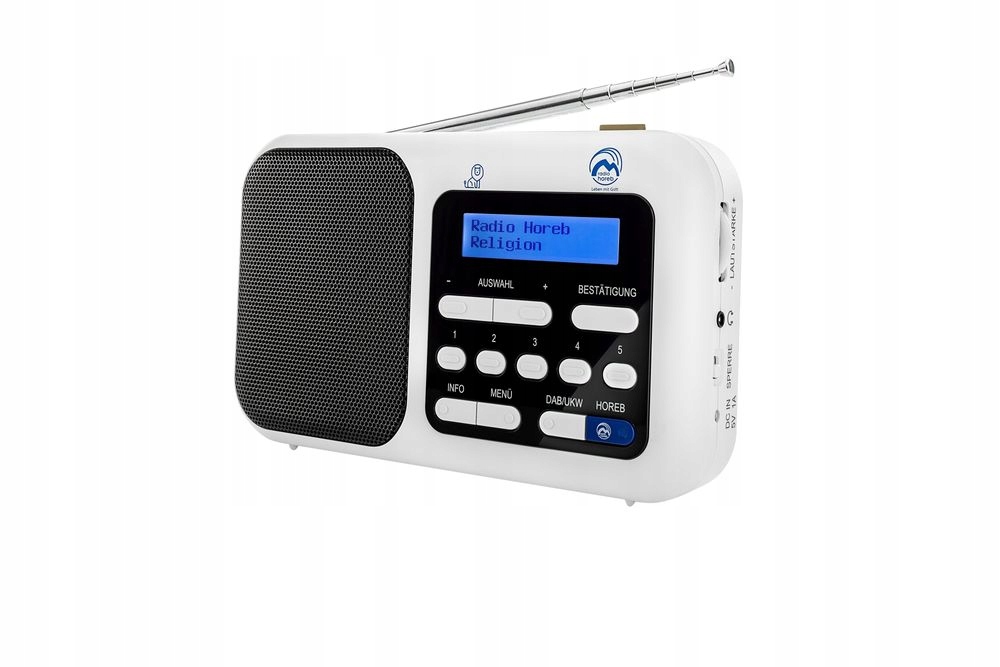 Radio Horeb Daniel — це компактне та стильне цифрове радіо з іншими функціями, які полегшують використання. Механічний регулятор гучності та механічний перемикач увімкнення/вимкнення, а також 5 додаткових кнопок пам’яті забезпечують зручне керування. Крім того, пристрій також може живитися від батарей незалежно від мережі.