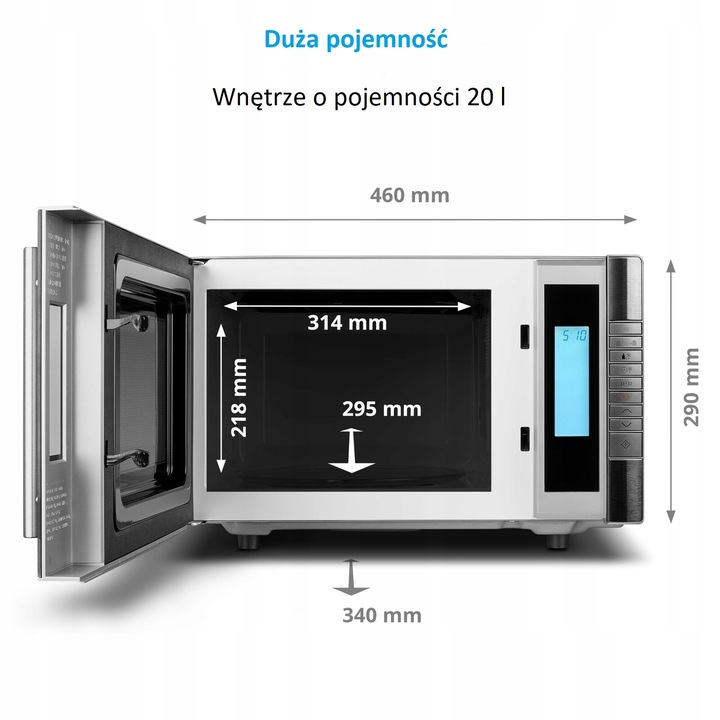 Мікрохвильова ємність становить 20 літрів , тому цей об'єм є достатнім, щоб мати можливість приготувати улюблену страву. Пристрій дуже простий у використанні. Піч виготовлена з нержавіючої сталі, завдяки якому продукт легко очистити, крім того, забруднення та бактерії не осідають на плиті так швидко. корпус також стійкий до корозії та високих температур.