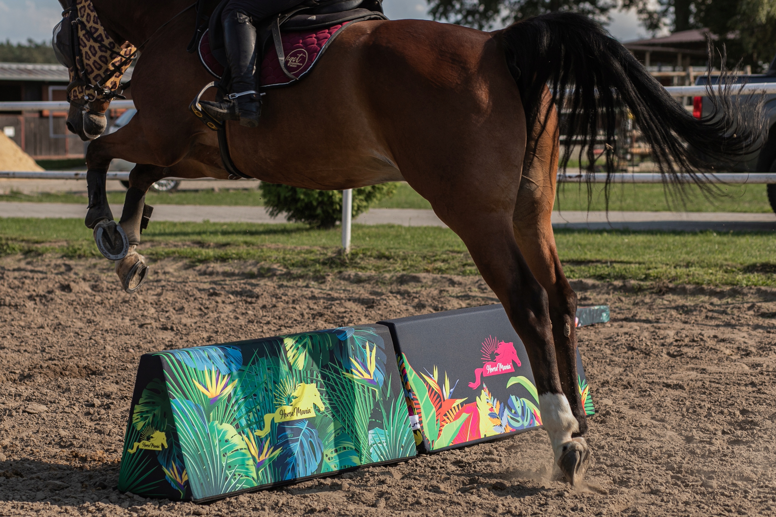 Вам цікаво, чи коні «поважають» м’які перешкоди, чи не топчуть їх? – навпаки – коні набагато більше зосереджені на «живих» забарвленнях і набагато більше займаються вправами.