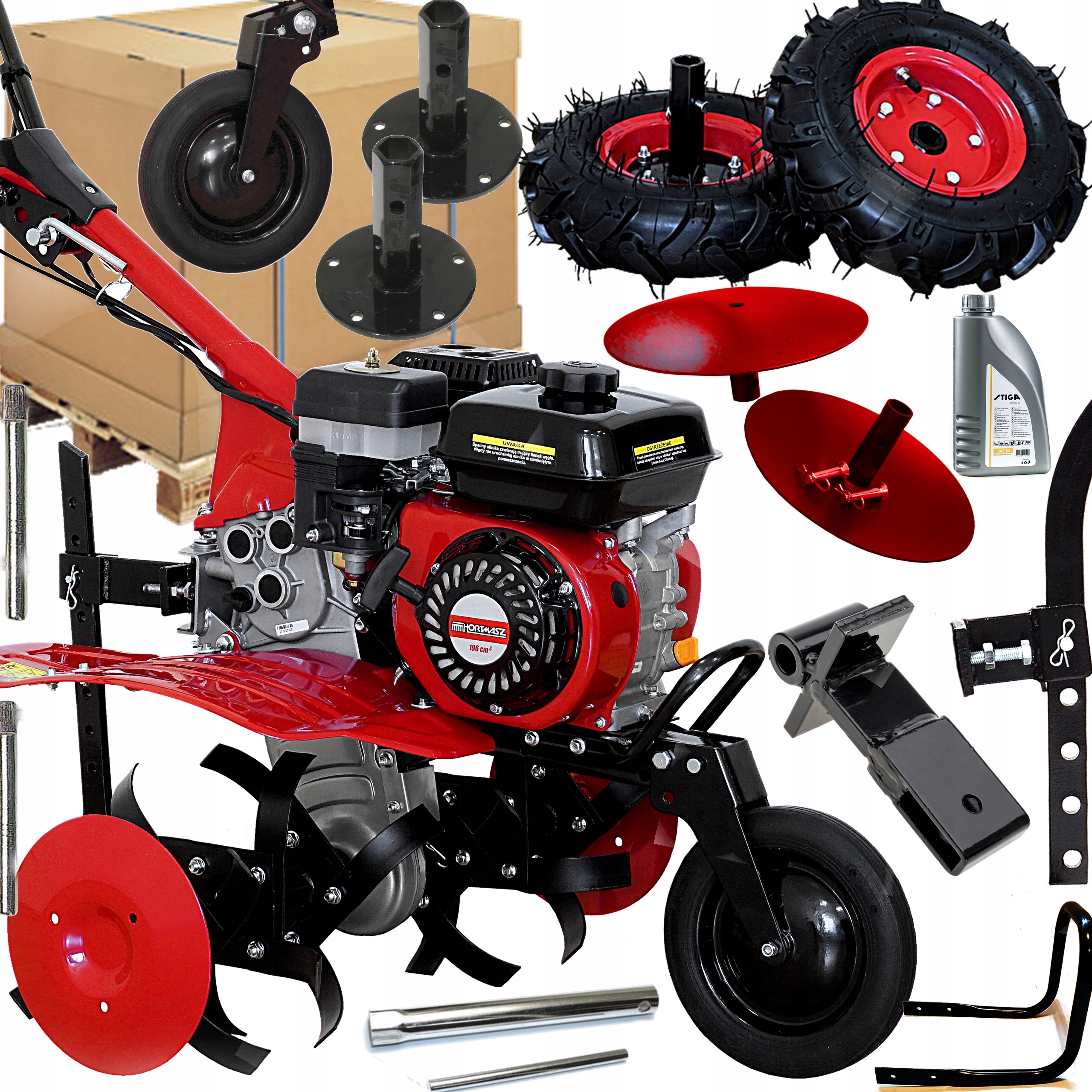 - Можливість використання додаткового обладнання: плуг, окучник, овочерізка, колеса сталеві, колеса гумові, причіп