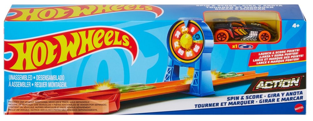 Набір Hot Wheels Action Spin & Score разом із транспортним засобом подарує неймовірні гоночні емоції та веселощі, здобуваючи все більше і більше очок на колесі Spin & Score, а кожна аварія змусить вашу дитину розважатися у власній кімнаті. Використовуючи різні системи, аксесуари та необхідні частини, які працюють разом, хлопчики можуть стати володарями гоночної траси. Їзда на трасі Action покращить інші траси серії.