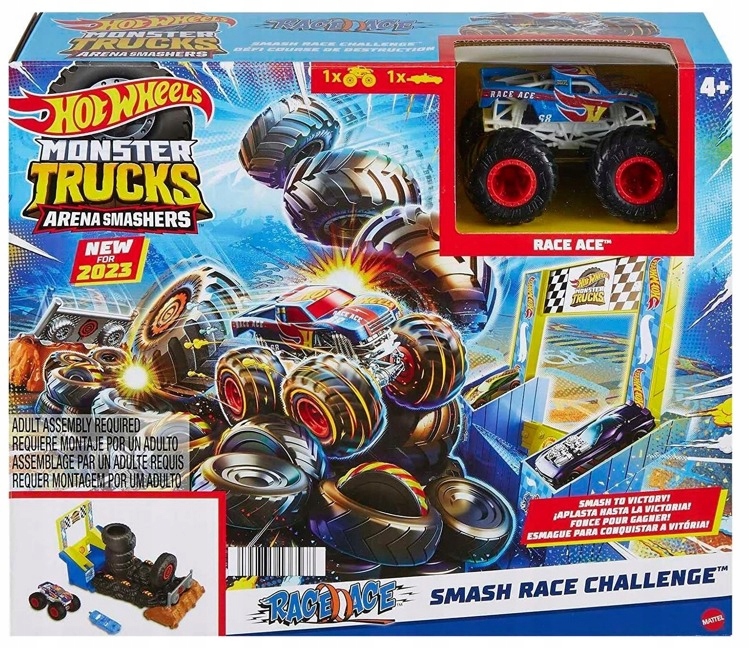 З Hot Wheels Monster Trucks Arena Smashers Race Ace Smash Race Challenge діти їздять до різних місць зіткнень, щоб розбити шини та виграти змагання.