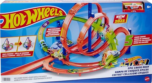 Набір Hot Wheels Action Epic Crash-Race Track - справжня насолода для всіх шанувальників гонок та адреналіну! Цей захоплюючий трек містить 5 зон зіткнення, 2 петлі та акселератор від двигуна, який не дає автомобілям зупинятися!