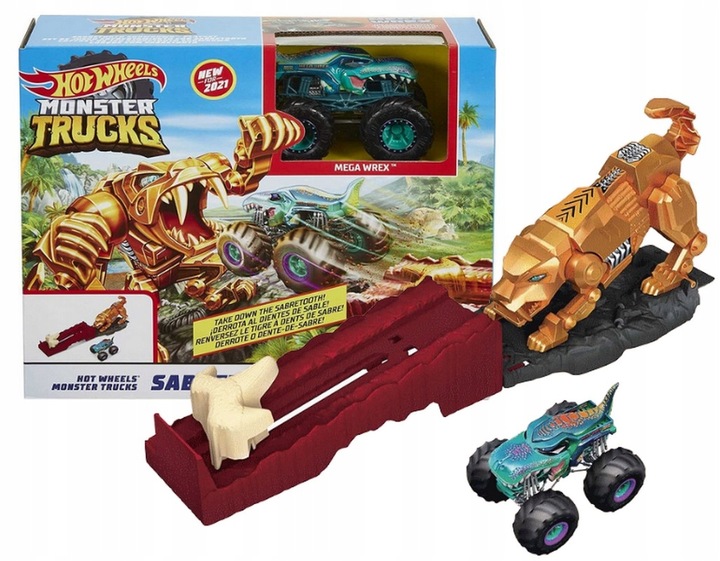 Ігровий набір Hot Wheels Monster Trucks Sabretooth Showdown дає змогу дітям вести доісторичну битву між диким шаблезубим тигром і динозавром-рептилією Мега Рексом у формі вантажівки-монстра!