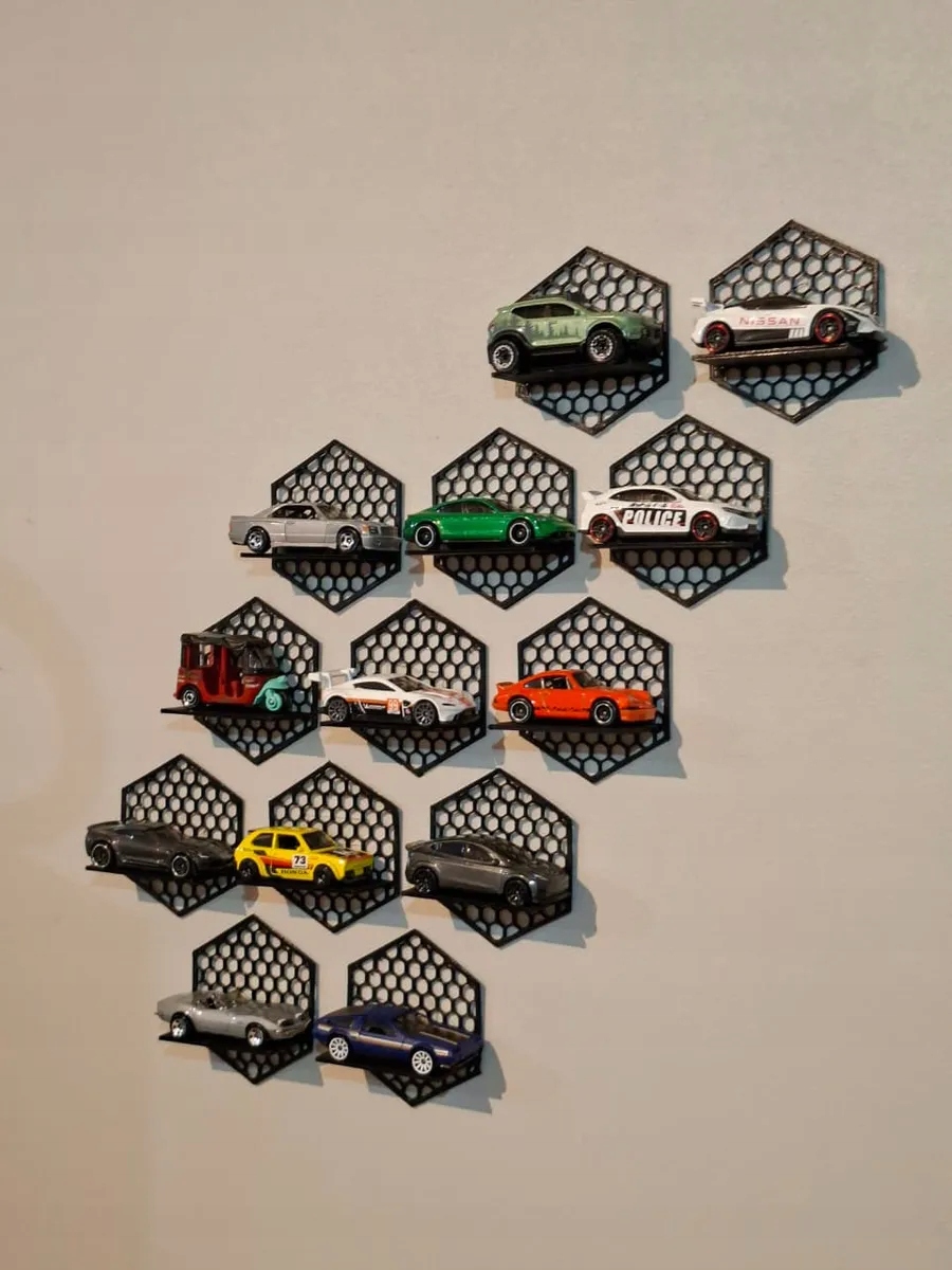 Ця підставка-модуль у формі стільника дозволяє виставляти ваші мініатюрні автомобілі (Hot Wheels, Matchbox тощо) як невелику галерею на стіні. Кожен модуль важить лише ~8,4 г і може бути об’єднаний у різні візерунки – прикраса та практичний органайзер в одному.