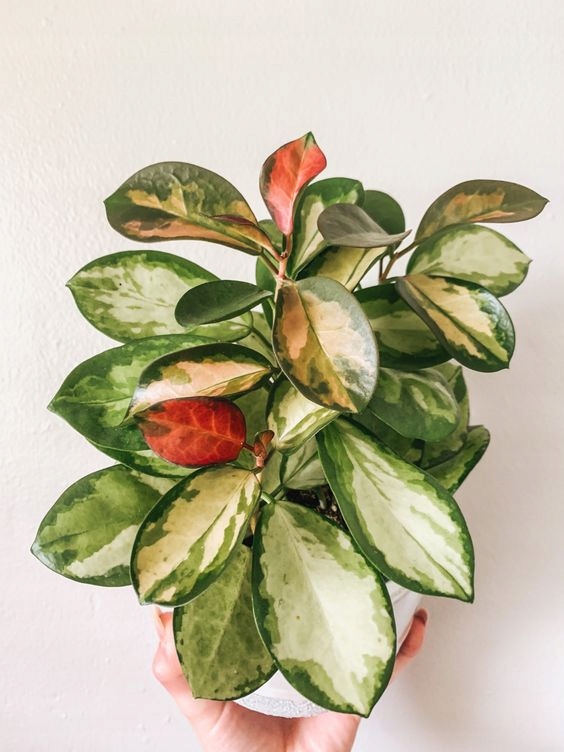 Ця прекрасна хойя має унікальний колір і малюнок листя. Центр листової пластини жовтий або світло-зелений, а краю темно-зелені. Молоде листя контрастно червоно-рожеве.
