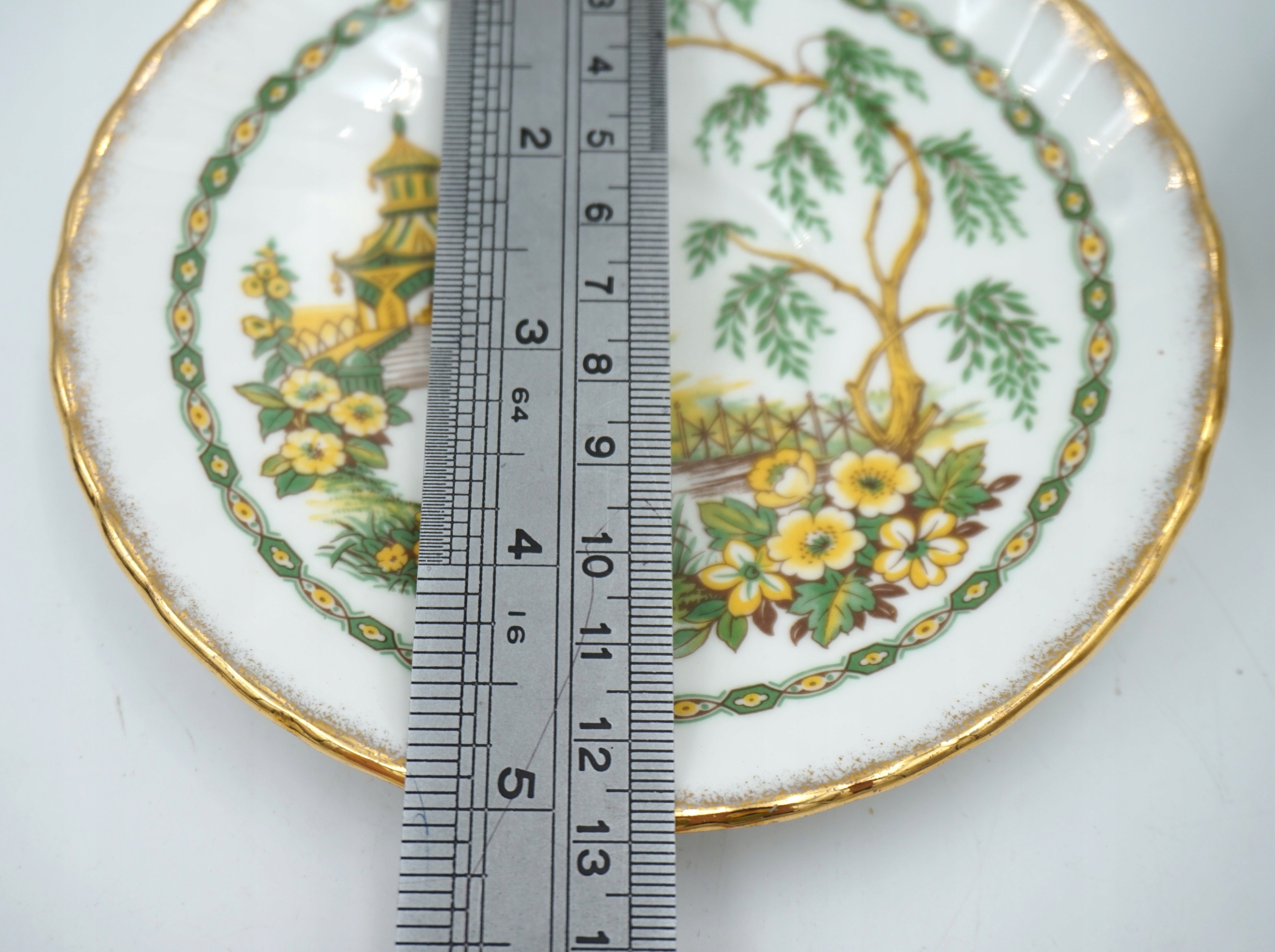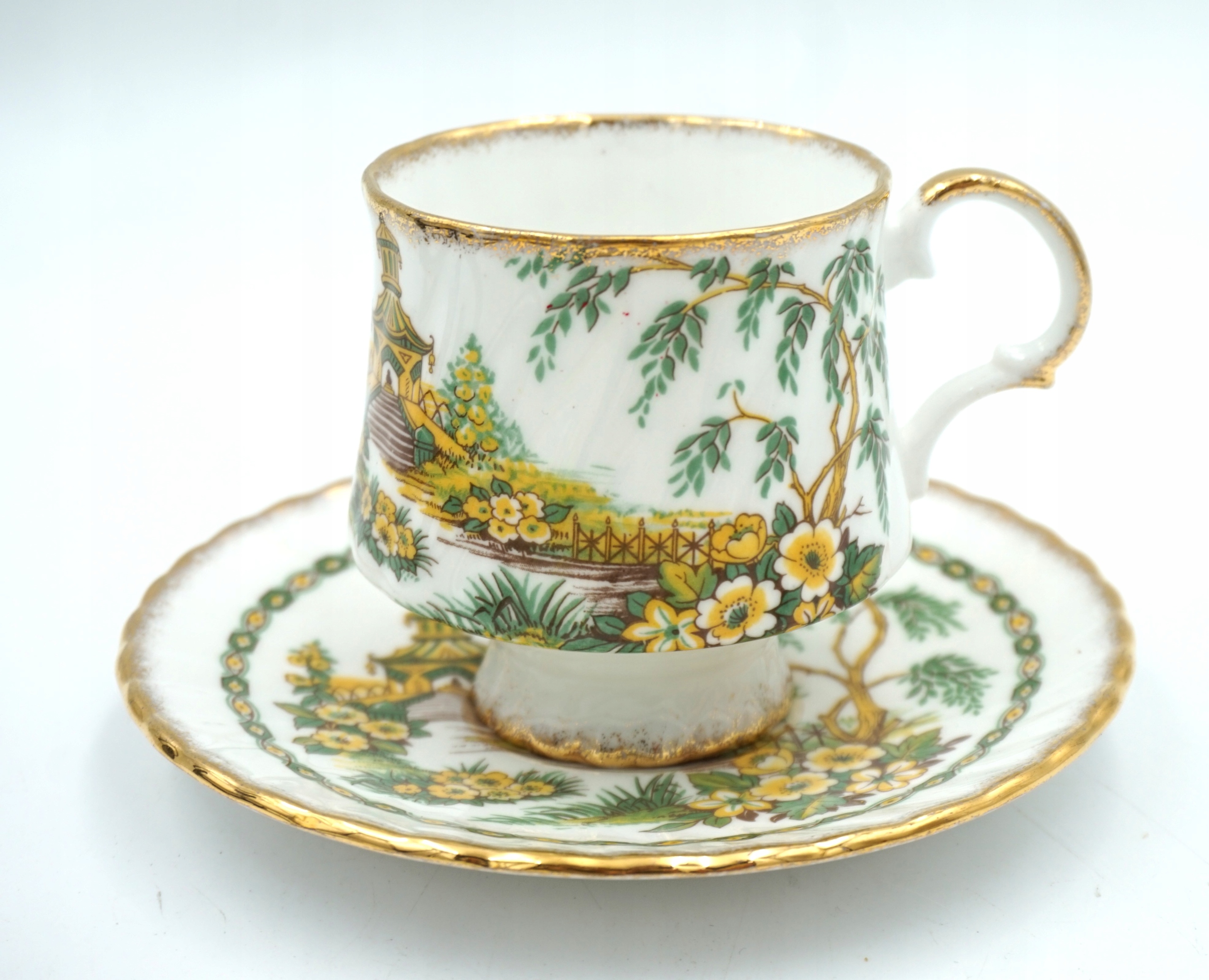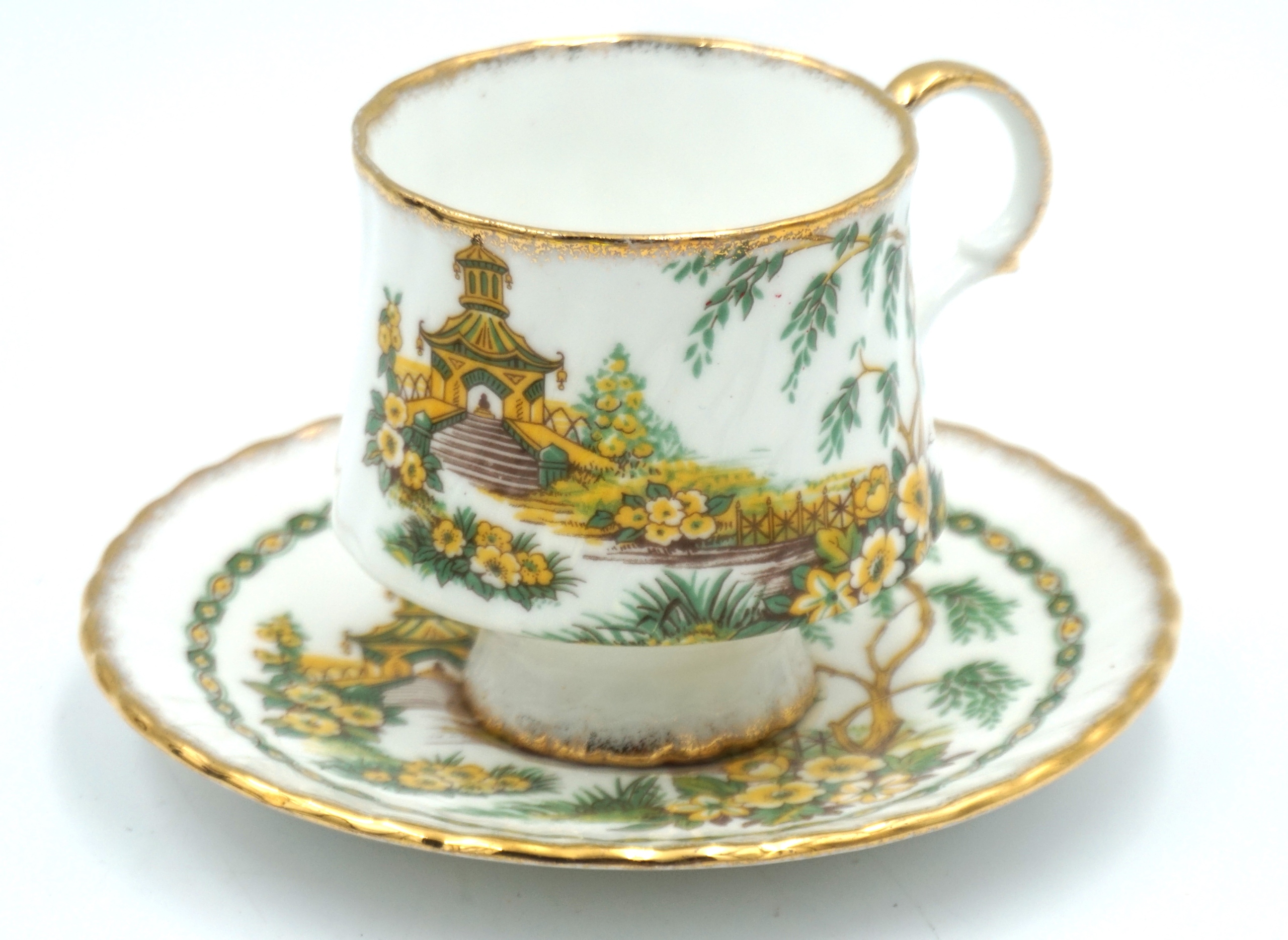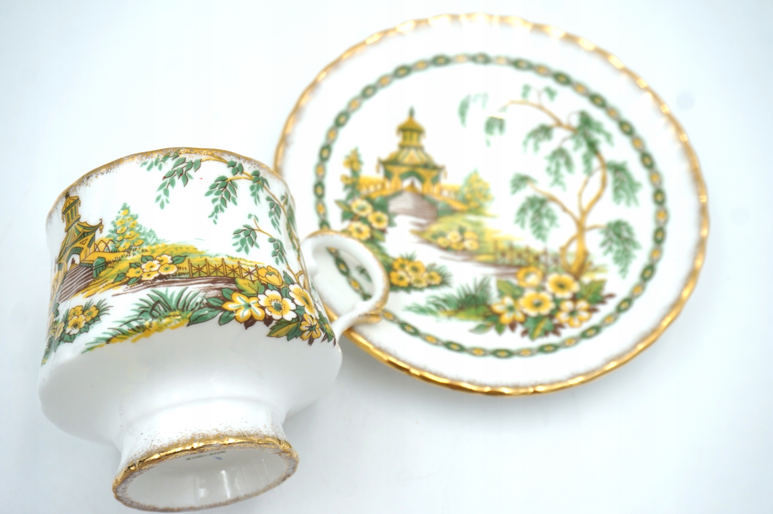 Біла порцеляна із зелено-жовтим пейзажем - з мотивом китайської пагоди, позолочена обробка