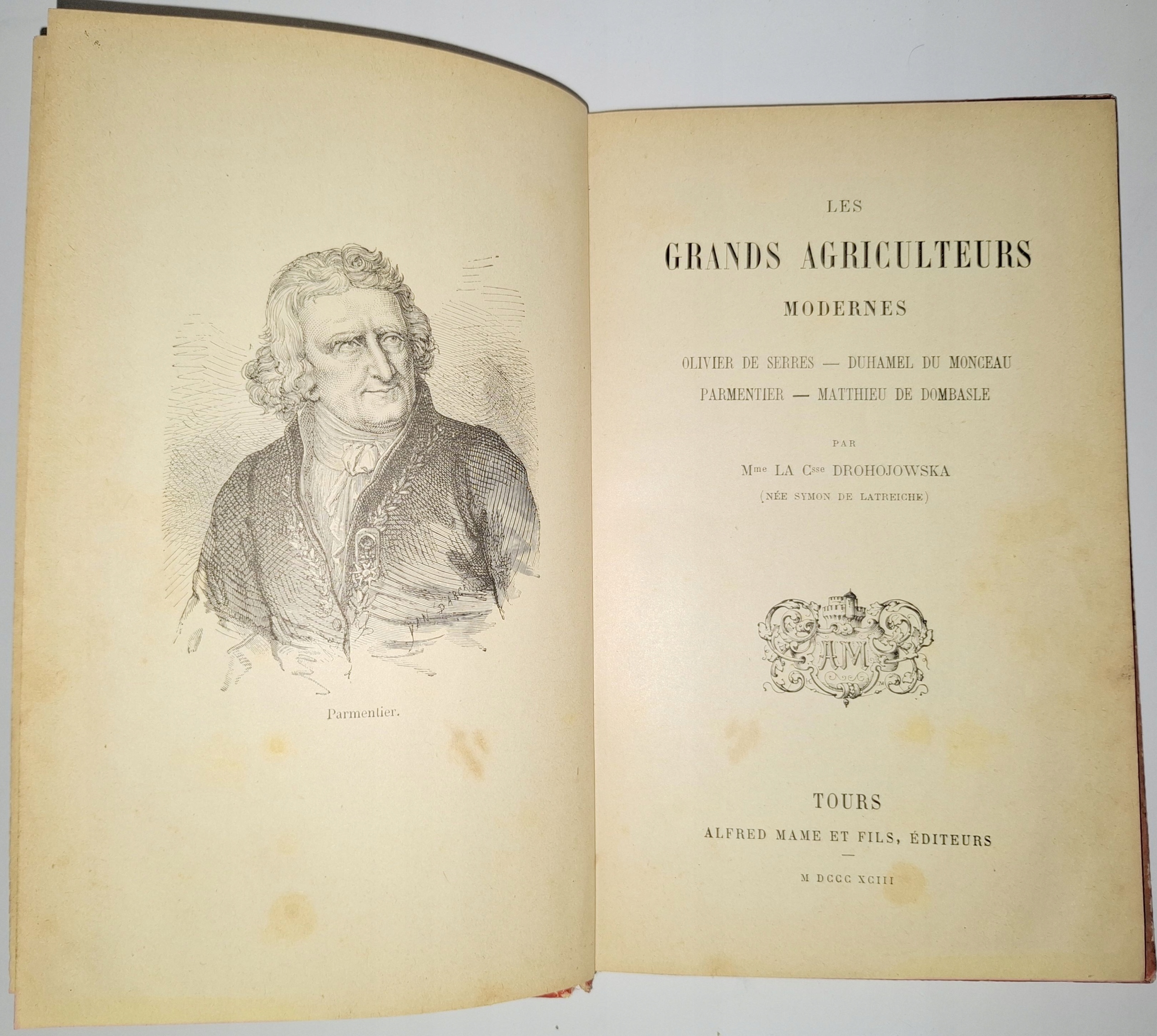 Ілюстрований твір графині Антоніни Дрогойовської про відомих французьких агрономів і піонерів сільське господарство та ведення фермерського господарства агрохарчування, враховуючи різні його аспекти, зокрема: популяризація вирощування картоплі у Франції Антуаном Парментьє. Текст, проілюстрований 9 гравюрами, включаючи повносторінкові портрети персонажів, рослин і жанрових сцен.