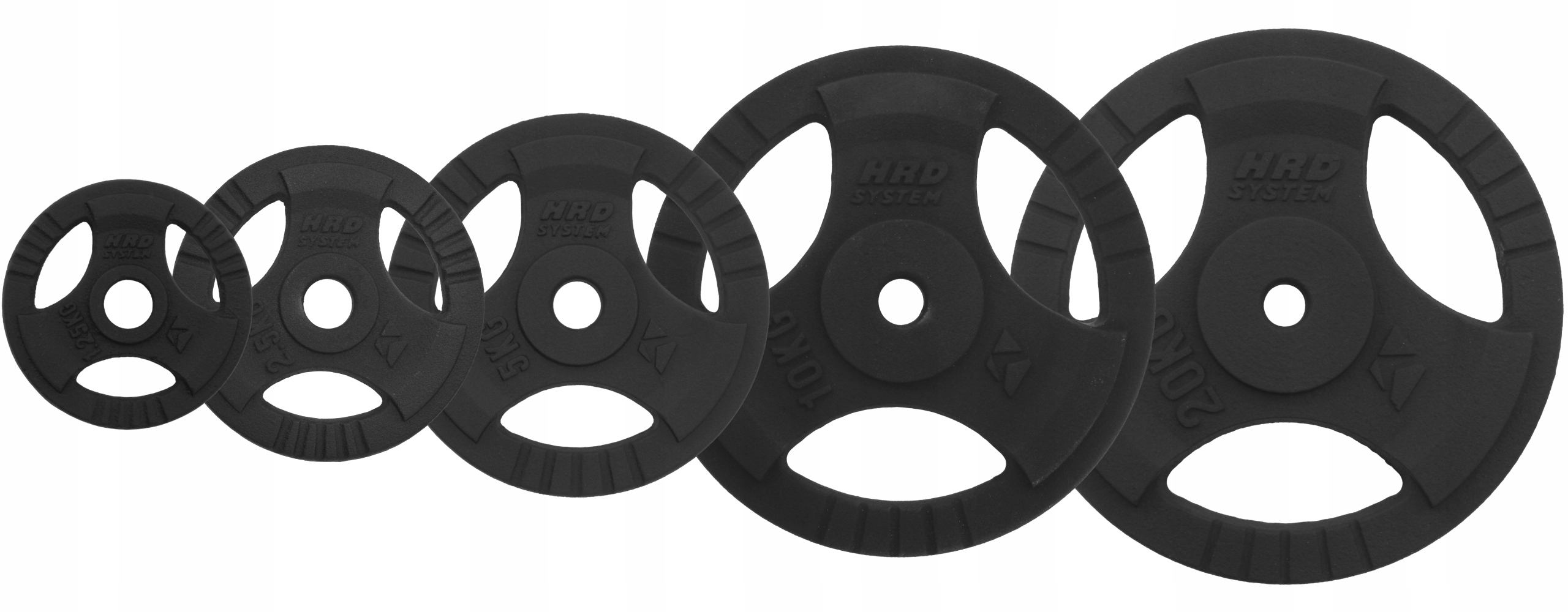 Чавунні пластини з конструкцією Tri-Grip, яка дозволяє швидко змінювати штангу чи штангу. спортивні зали. Поверхня захищена спеціальною фарбою.