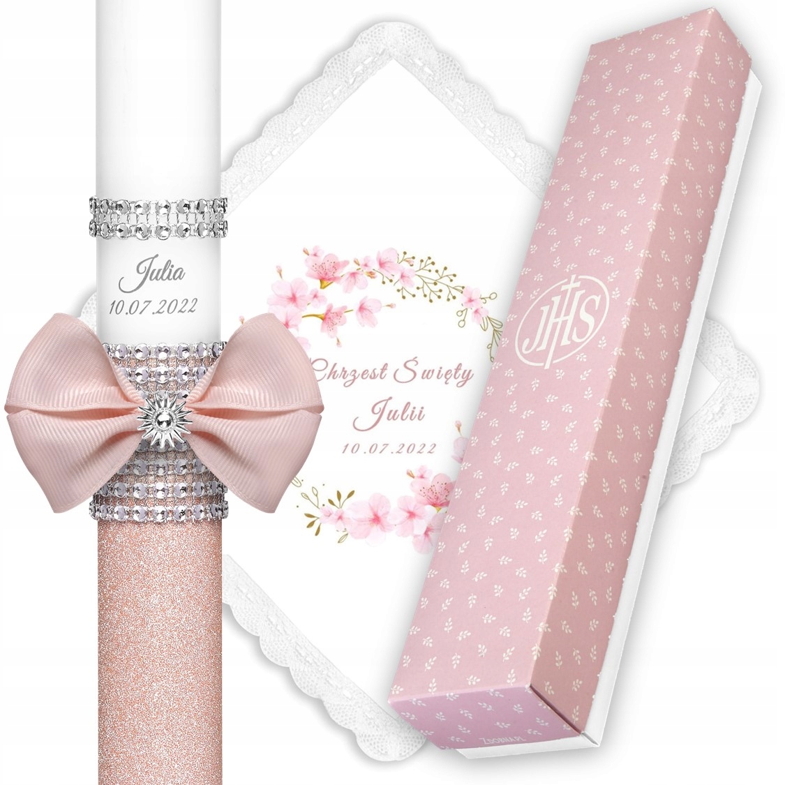 Елегантна рожева свічка прикрашена унікальними елементами: блискучими деталями, бантом ручної роботи з декоративною аплікацією. та персоналізація: ім'я дитини та дата церемонії.