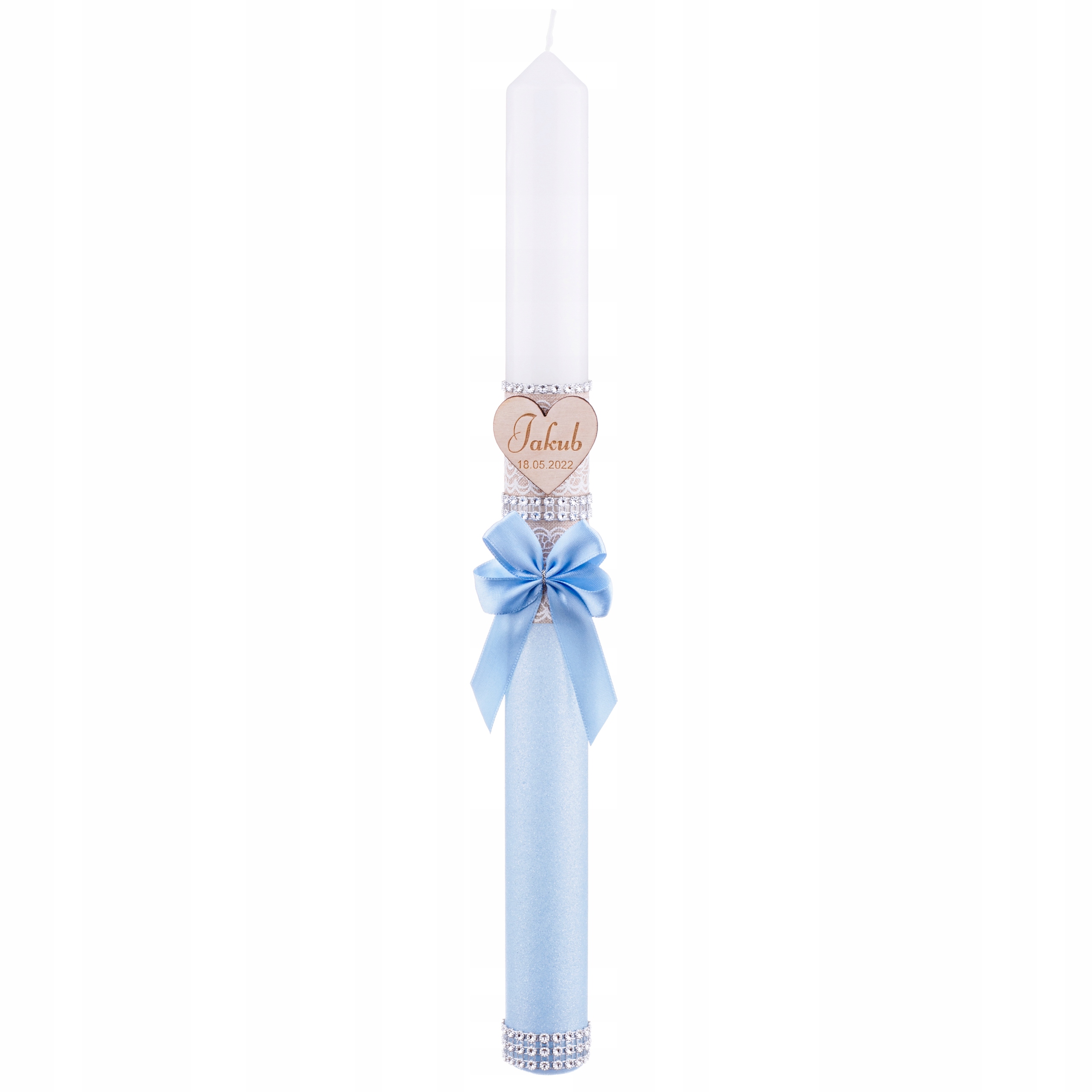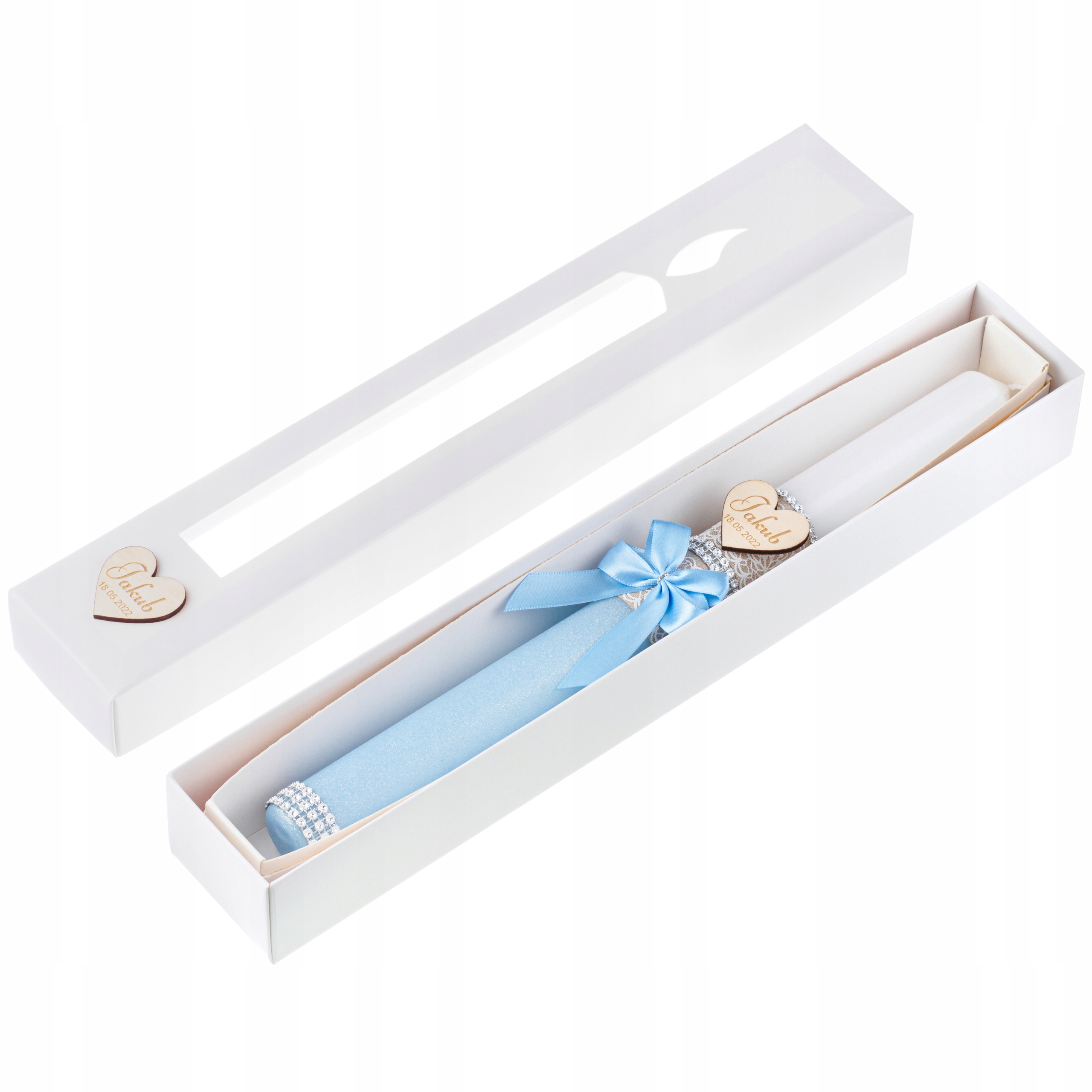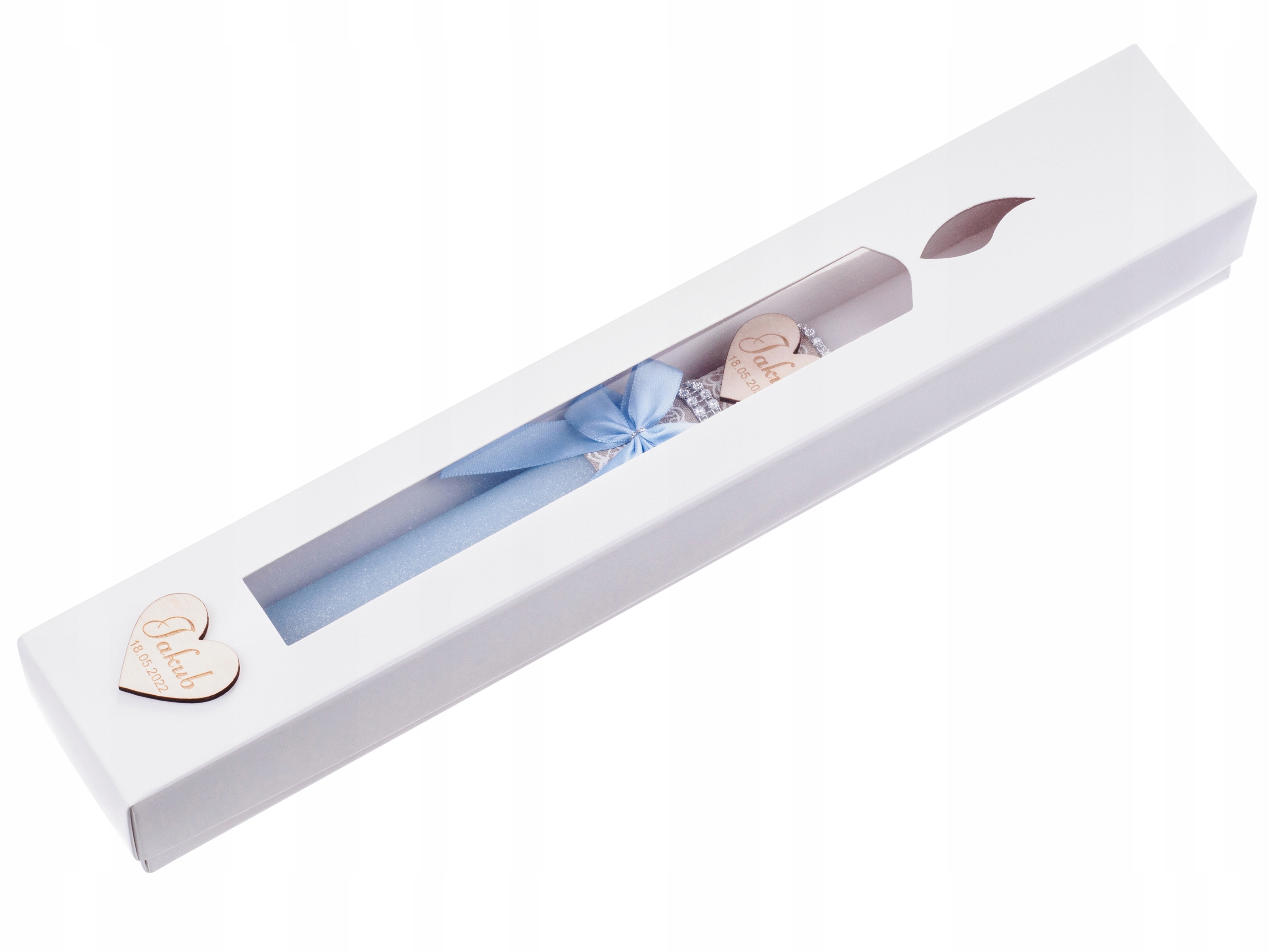 Свічка упакована в елегантну коробку. Подібно до свічки, до комплекту входить дерев’яне серце, на якому ми можемо вигравірувати ім’я дитини та дату свята.