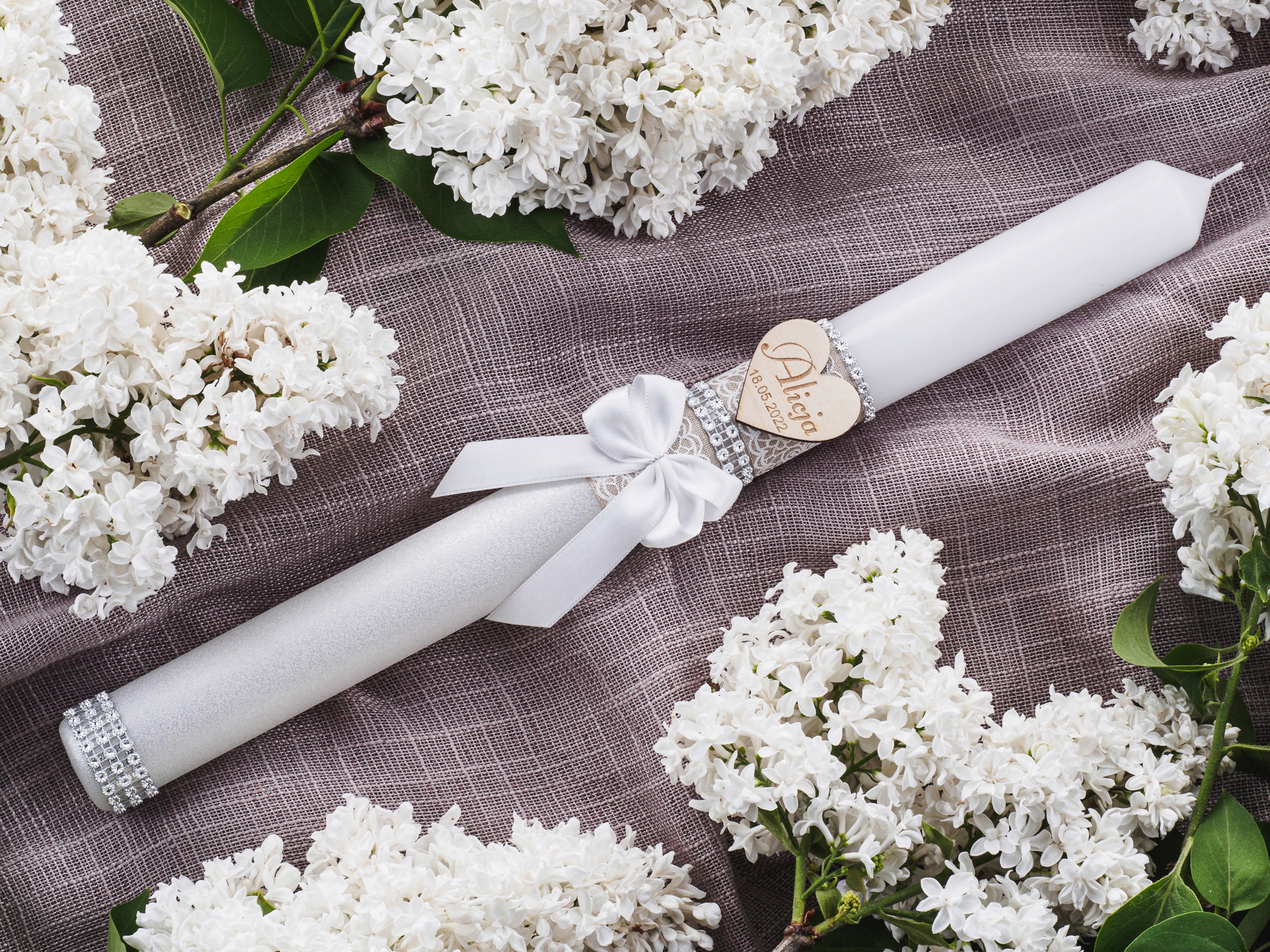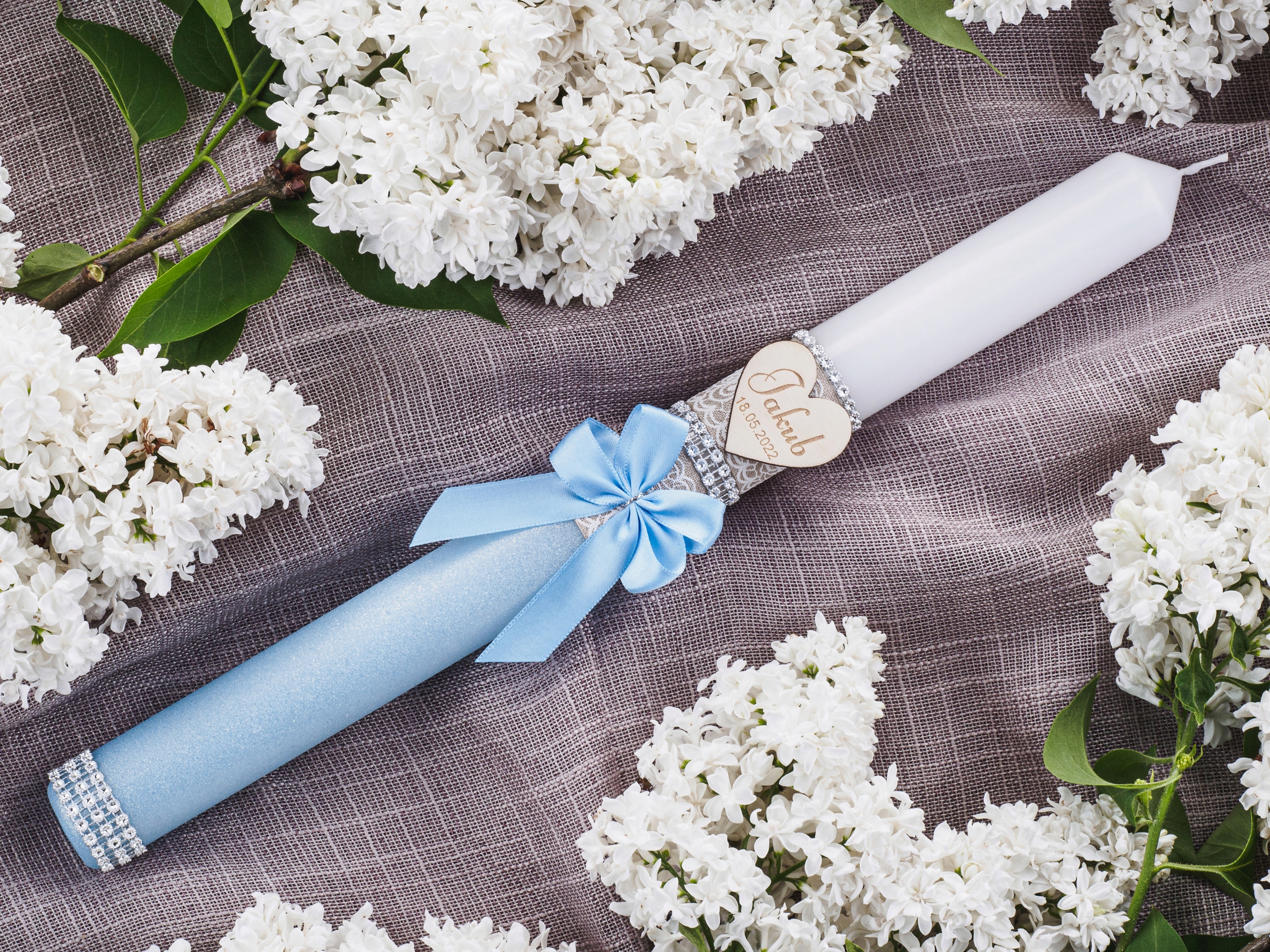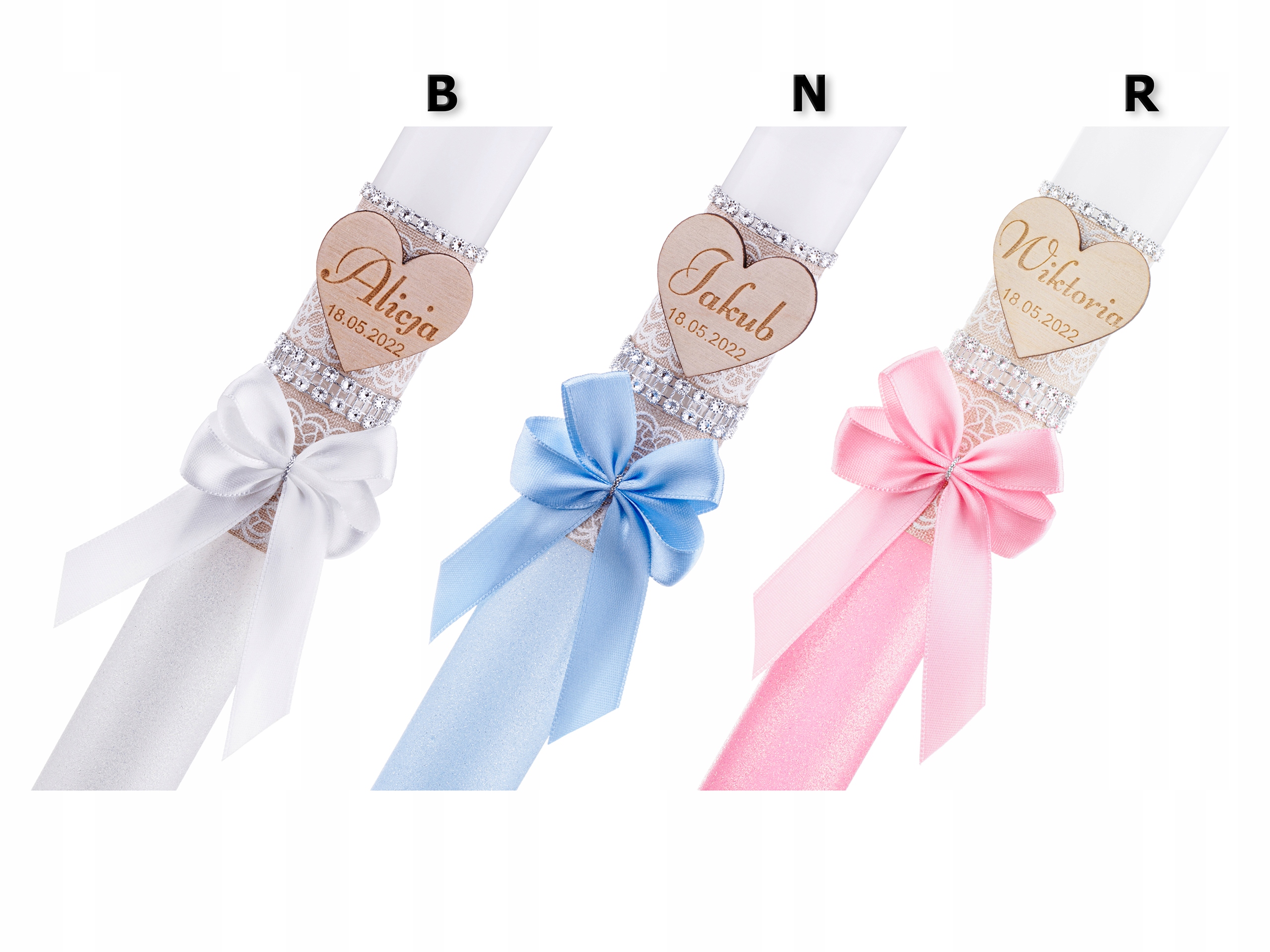 Свічка упакована в елегантну коробку. Подібно до свічки, до комплекту входить дерев’яне серце, на якому ми можемо вигравірувати ім’я дитини та дату свята.