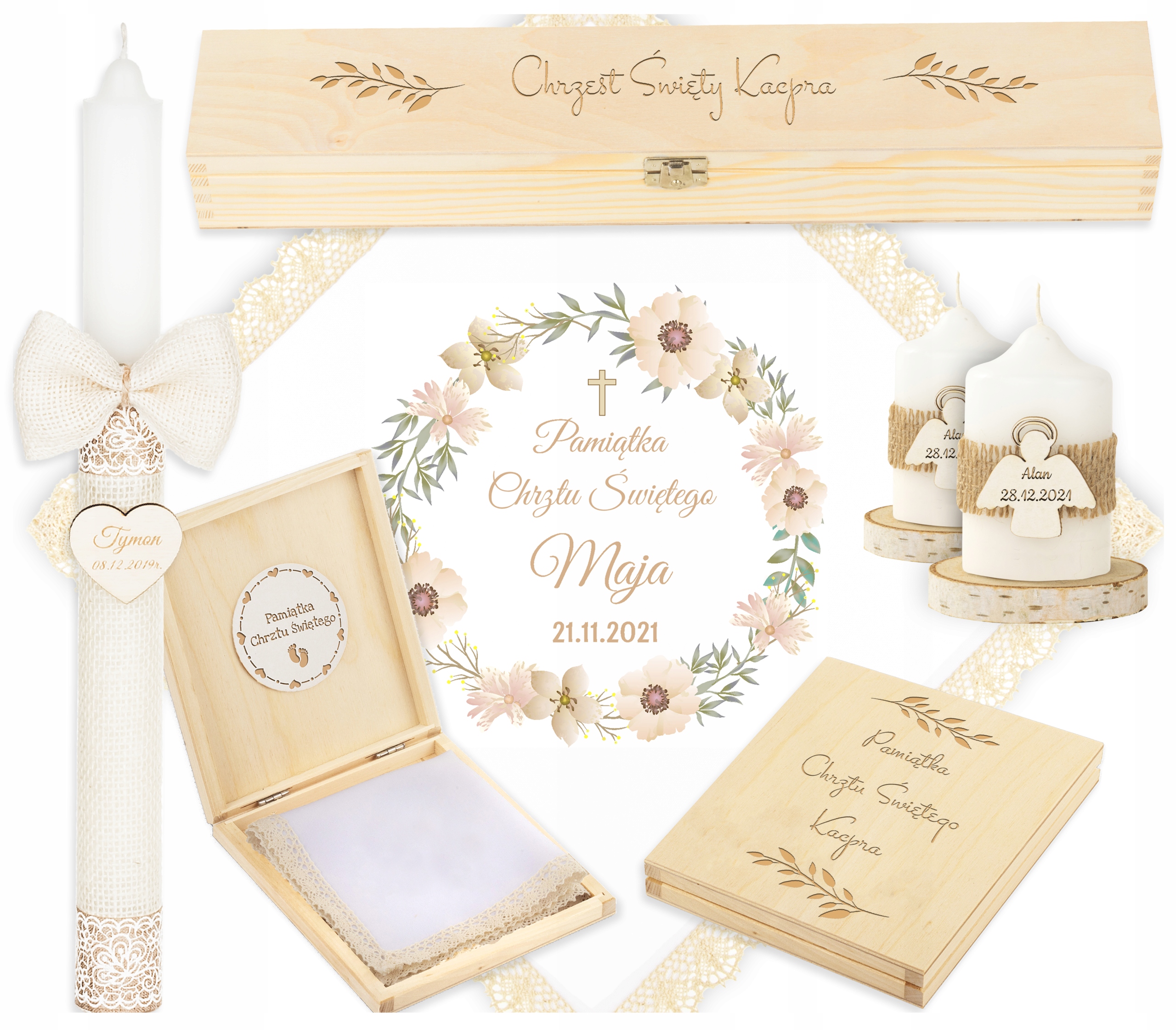 - лазерне гравіювання – до свічки кріпиться кулон, на якому ми гравіруємо ім'я дитини та дата святкування . Для гравірування ми використовуємо новітнє обладнання від світового лідера. На дерев'яну коробку для свічки та тканину також нанесено лазерне маркування.