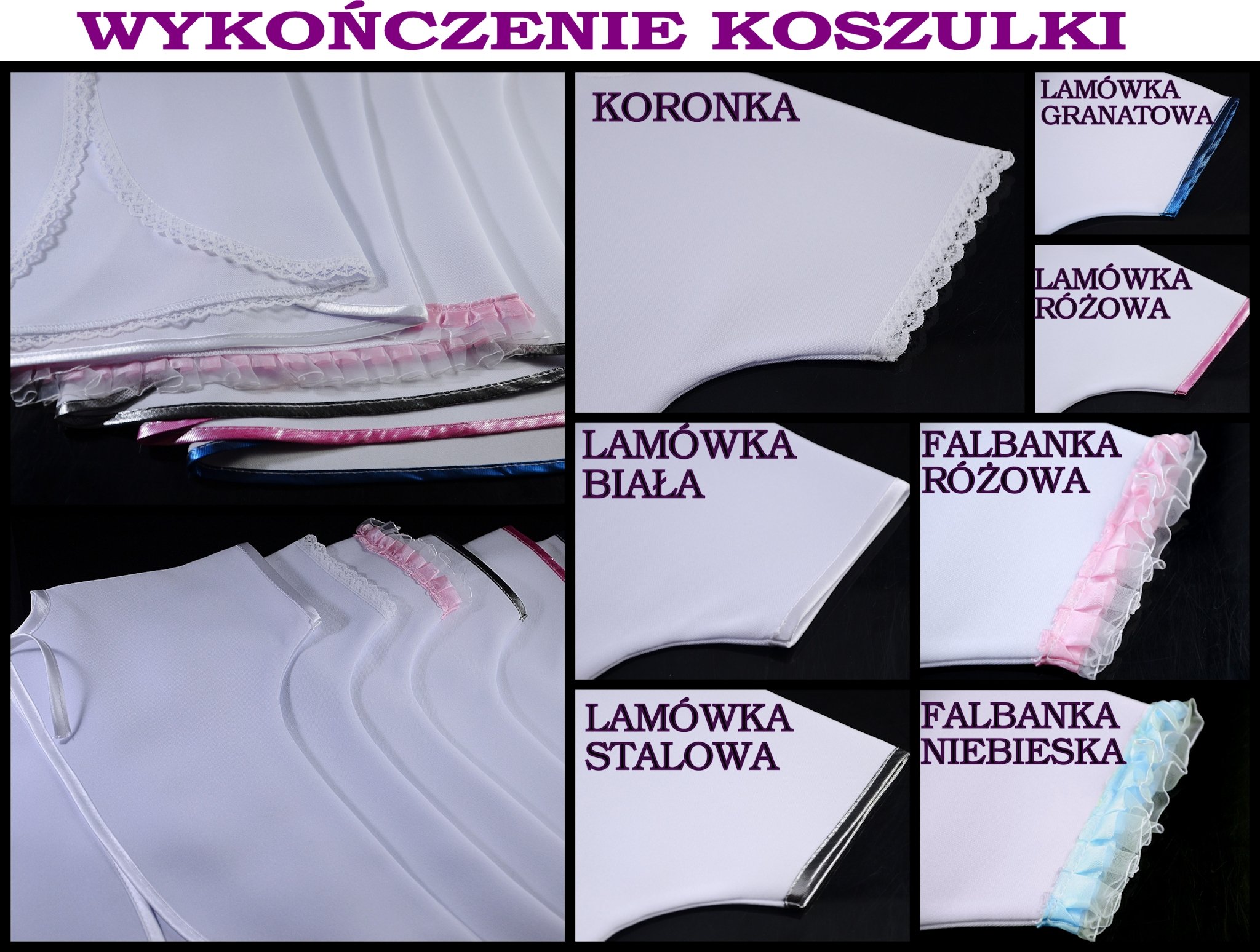 2) тип обробки одягу (мереживо / біла обробка / сталева обробка / рожева обробка / темно-синя обробка / рожева рюш / синя рюш)