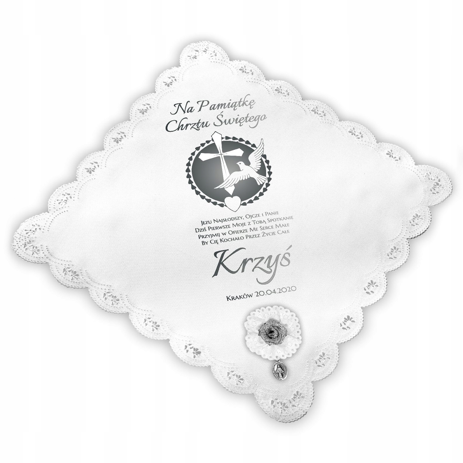 Атласна хрещальна риза з іменем, датою, містом і молитвою (молитва на викрійках від SO4 до SO15).