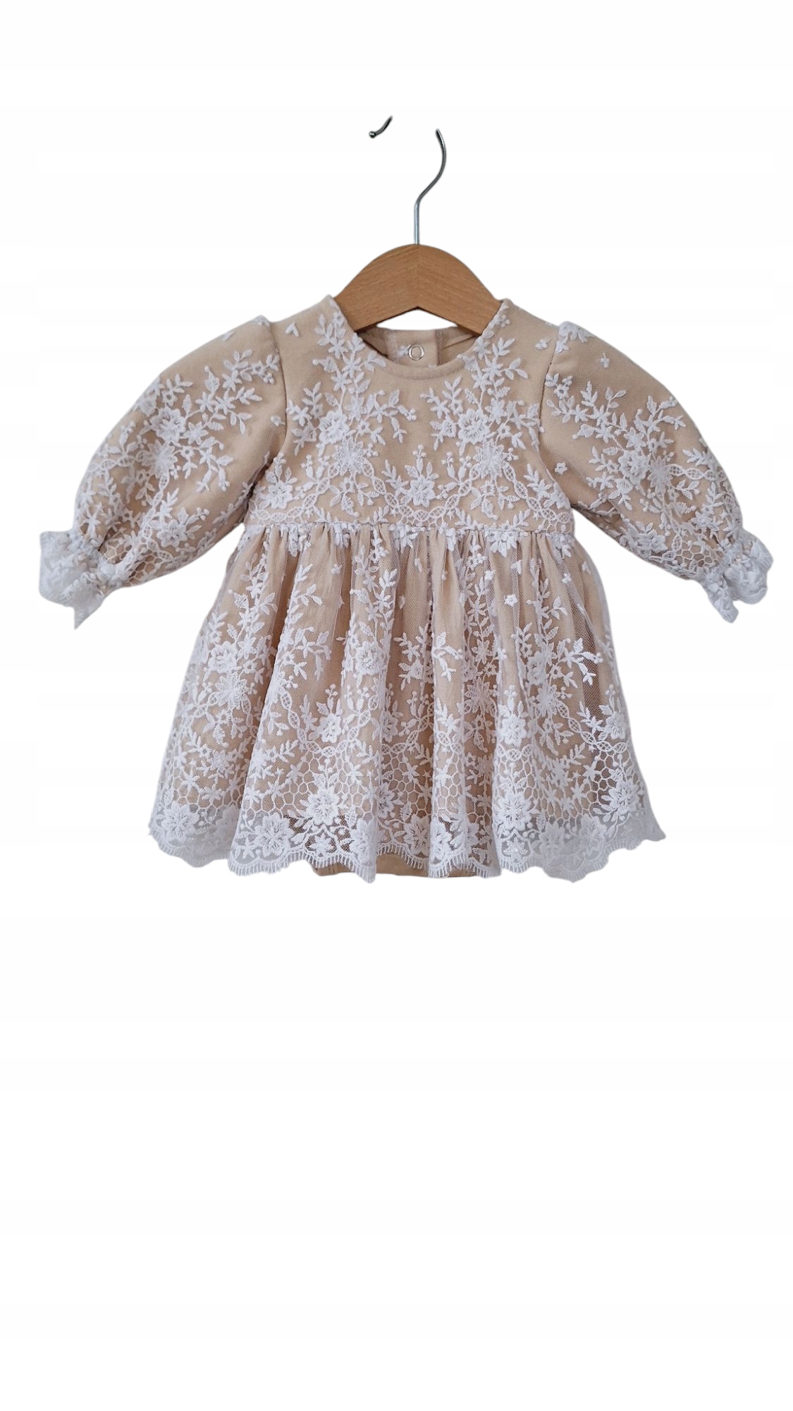 Тканина, з якої вшито плаття, вони м'які та придатні для немовлят та маленьких дітей. Сукня в сукні була виготовлена з найвищої якості бавовни, польської преміум -в'язаної виробництва з Atest, в бежеві, 95 % бавовни, 5 % еластану. Дно сукні - це шар тонкої бавовни ,, гарне вишите мереживо, приємне і м'яке на дотик, наноситься на всю сукню. На задній частині плаття кріпиться пресом.