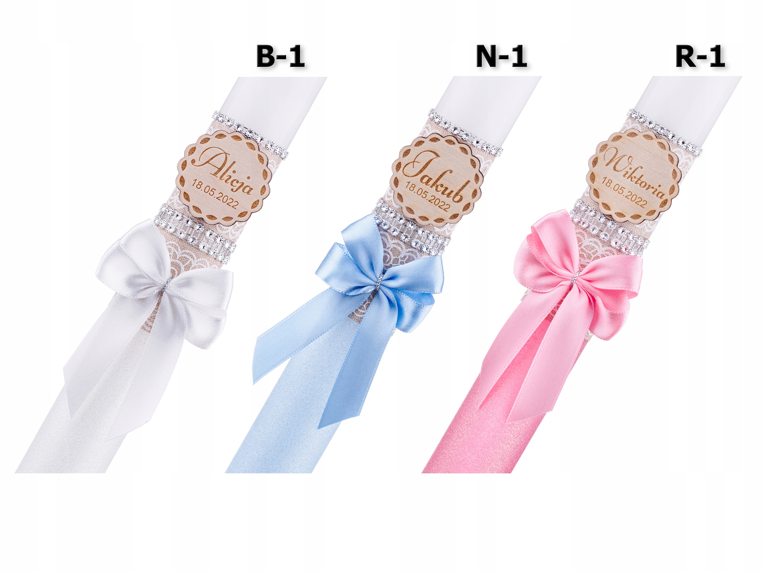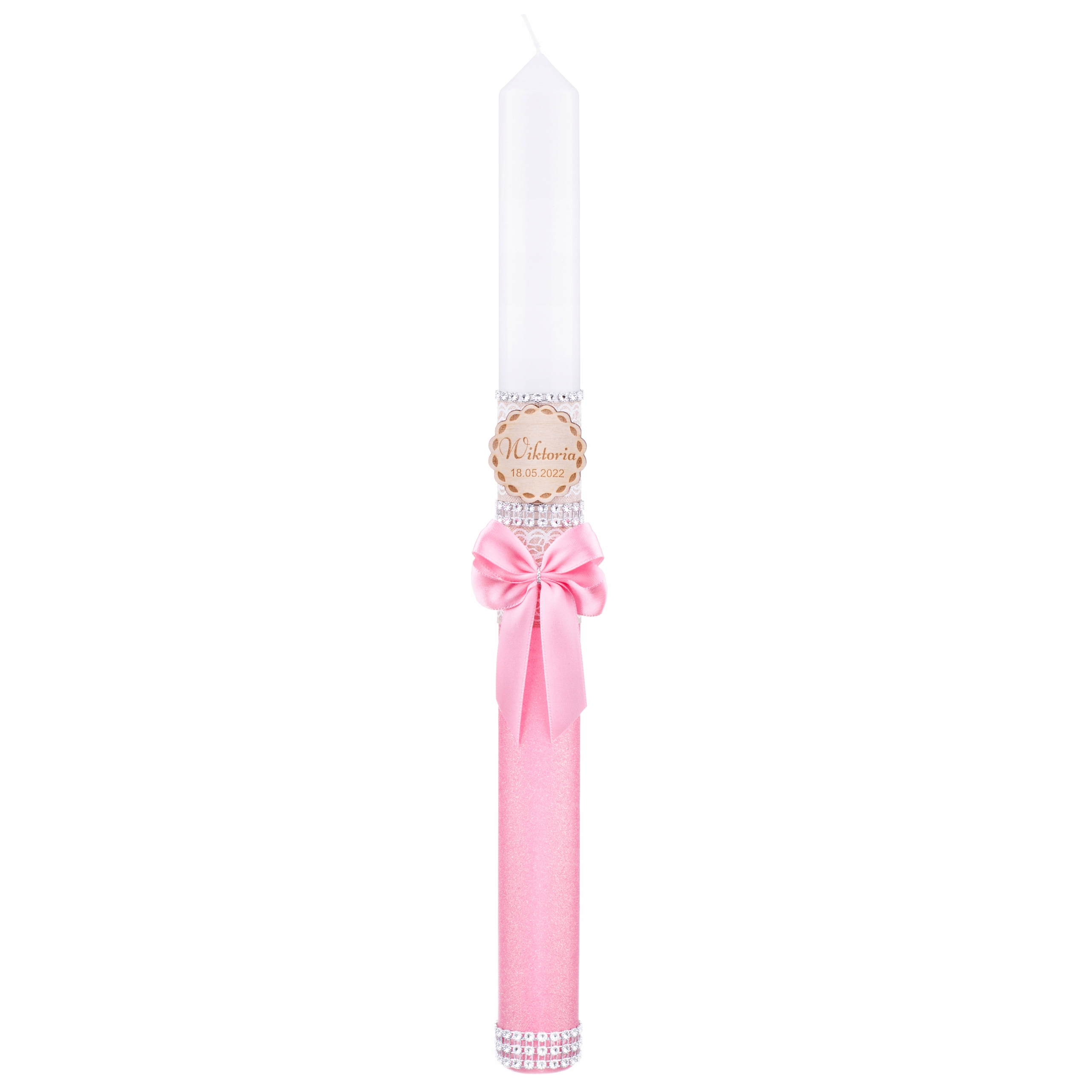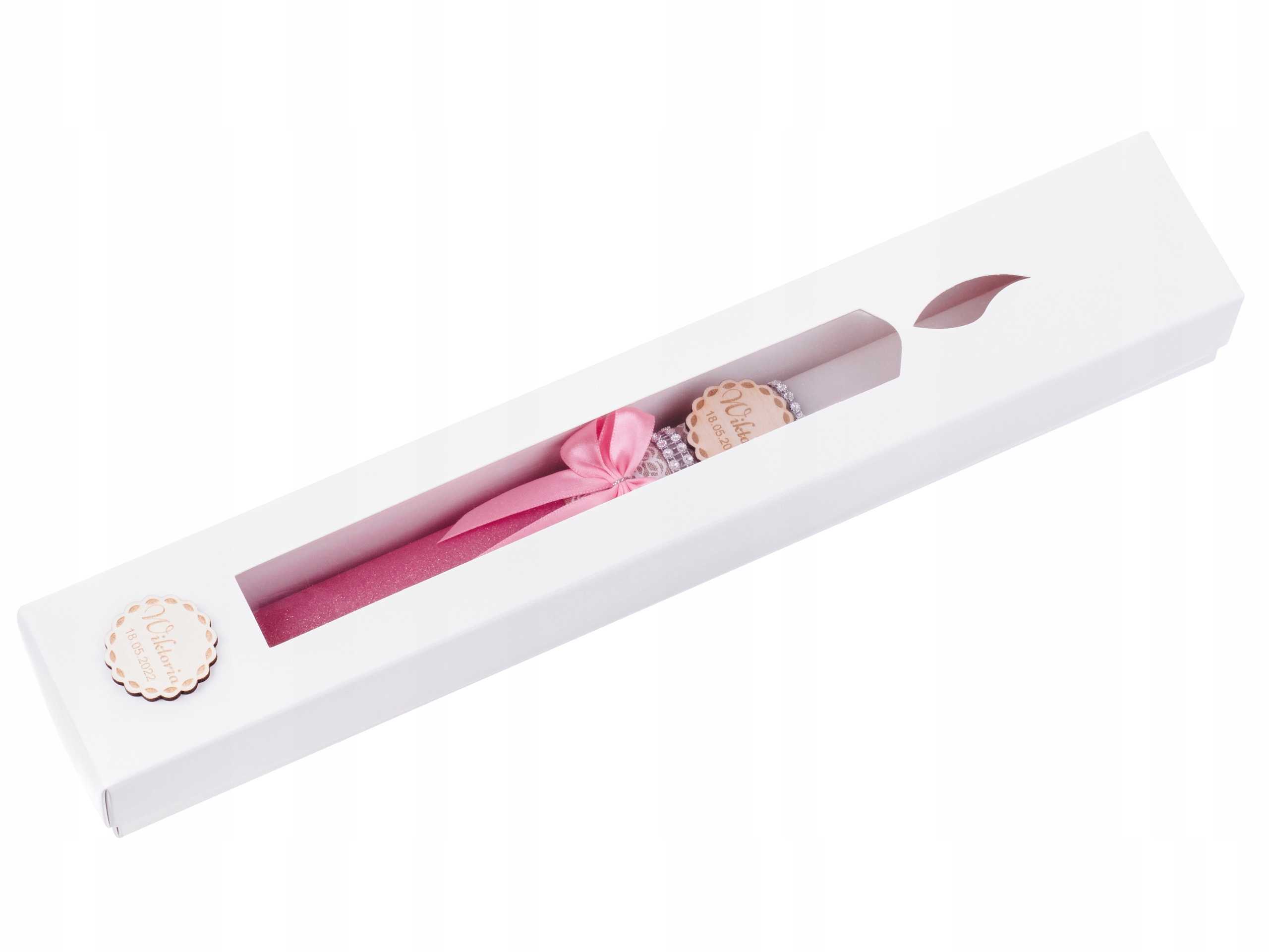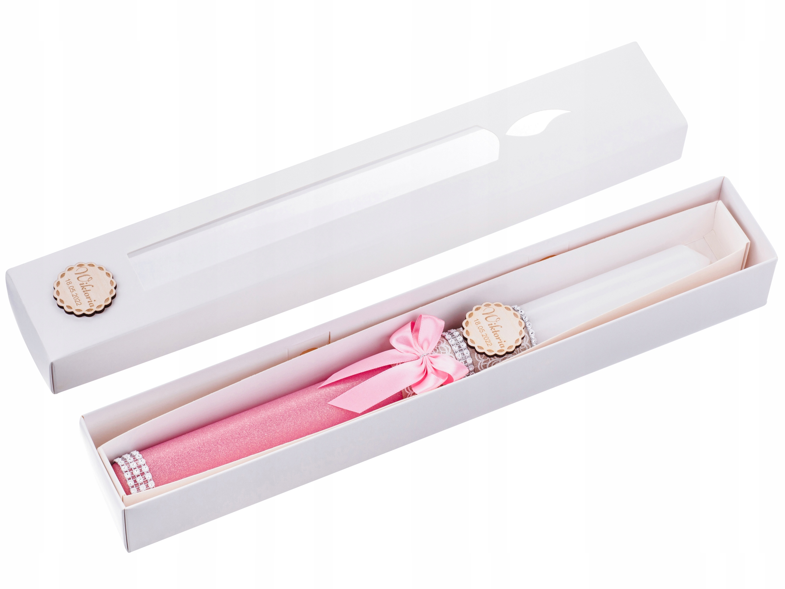 Свічка упакована в елегантну коробку. Як і свічка, в коробці також є дерев'яна підвіска для набору, на якій ми можемо вигравірувати ім'я дитини та дату свята.