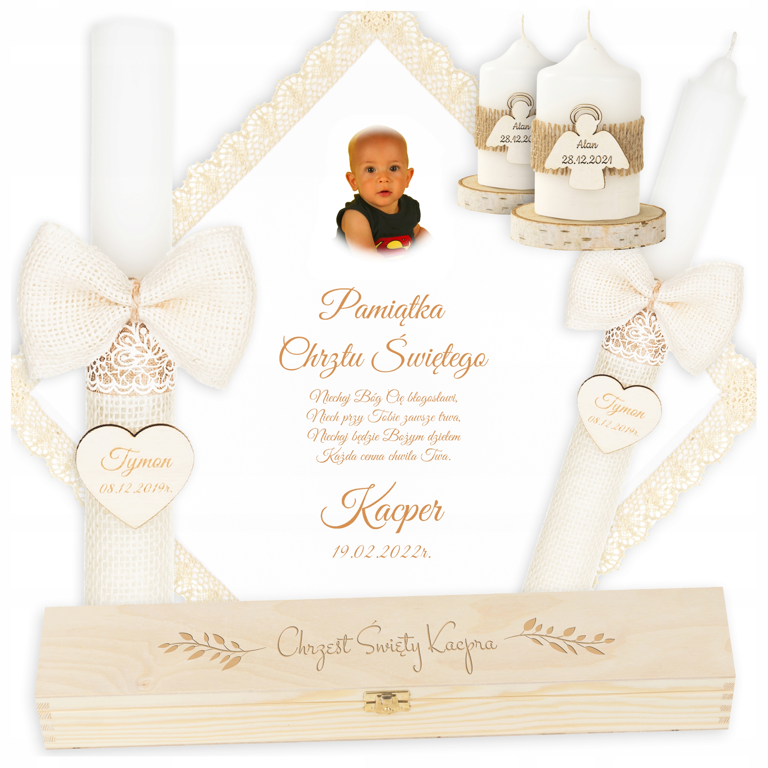 - ремісничий - Свічка загорнута в джутовий матеріал, додатково прикрашений у двох місцях декоративного стрічка. Ютова -лук із жорсткого матеріалу прив’язується до свічки, приклеєний і зав'язаний струною. , на якому ми залучаємо ім'я дитини та дату церемонії. Для гравірування ми використовуємо останні пристрої світового лідера. Зверніть увагу на надзвичайно ретельну подолу та закінчення в кутах сміття. Завдяки співпраці з професійними кравцями, халат та подол - прекрасна композиція.