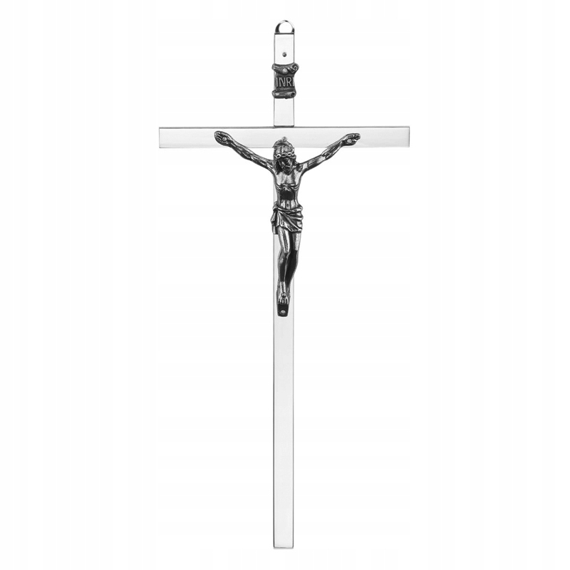 Срібний підвісний хрестик, висота 18 см, виготовлений з латунного стержня та покритий нікелем. Образ Христа виготовлений зі сплаву цинку, також покритий гальванічним покриттям. Вся річ була захищена високоякісними лаками, які захищають від потьмяніння і водночас надають неповторного блиску. Надійне та довговічне виготовлення з увагою до деталей від польської компанії з майже 40-річною традицією. Хрестик можна повісити на стіну вдома або на роботі - він оснащений практичною ручкою.
