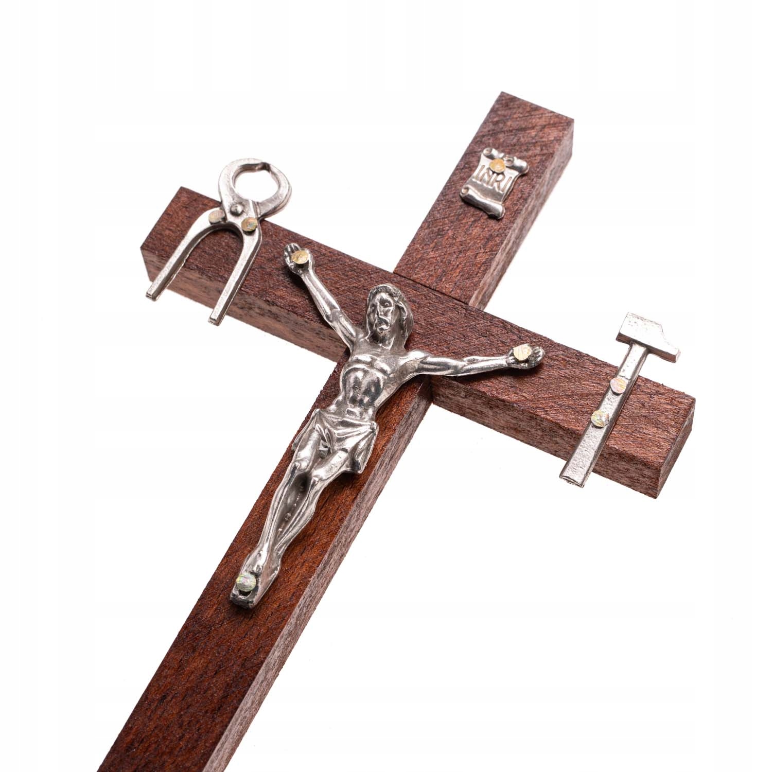 Настінний хрест із бука з текстурою, характерною для цієї породи дерева. Лакований. Господь Ісус виготовлений зі сплаву металів цинк-Zn і алюміній-Al кольору старого срібла. Польський виріб.